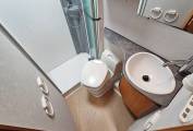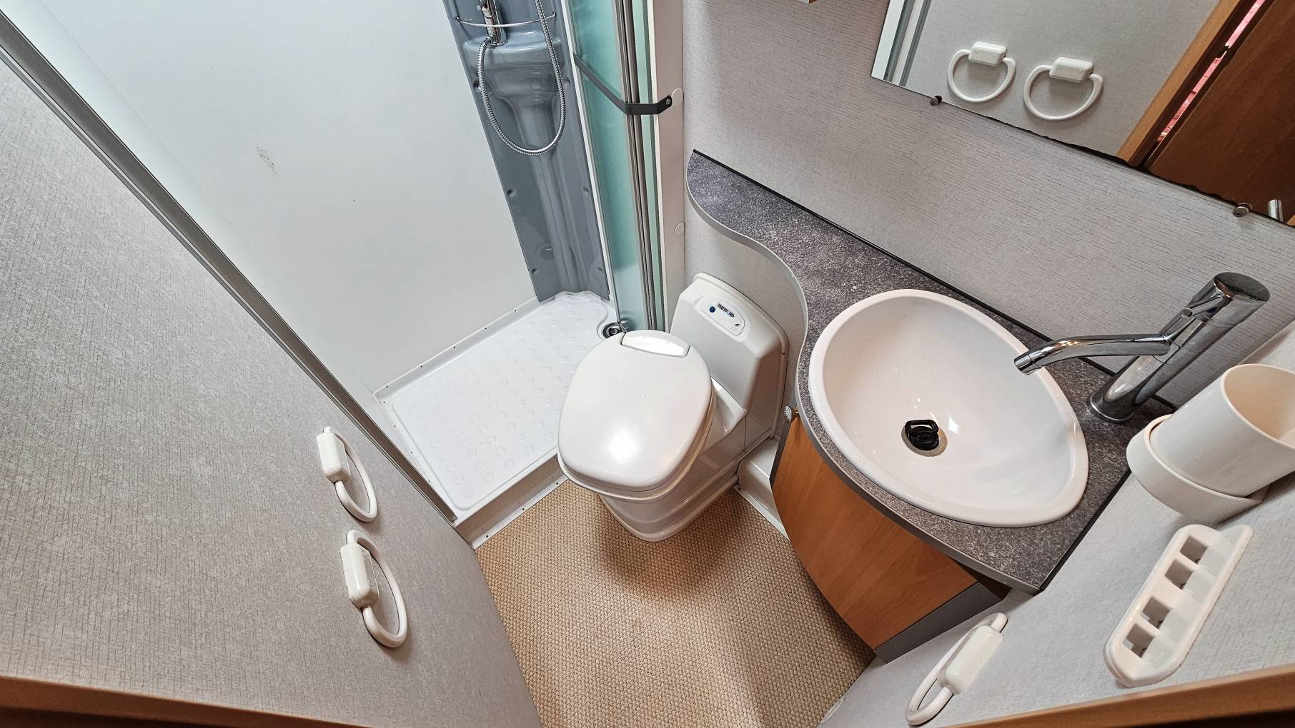 The Bathroom is light & spacious, it has a Thetford swivel top fresh flush cassette toilet and a separate shower to the rear. There is a built in wash hand basin with Chrome mixer tap, storage cupboard below and a further vanity style cupboard above.