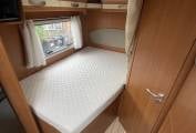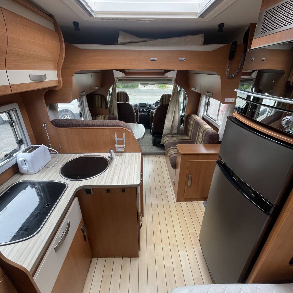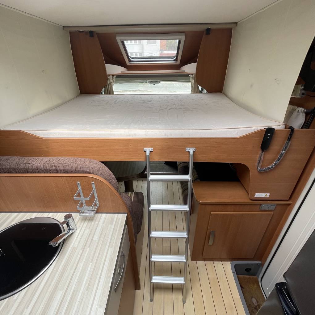 Moving to the dinette area you get more than enough space for five adults. It has a good sized table and offers a brilliant entertaining area with lots of windows giving you panoramic views of your holiday destination. Above the dinette you have a electric drop down bed which creates you a big double for your travelling passengers. At the front of the motorhome you have two swivel seats as well as cab air conditioning.