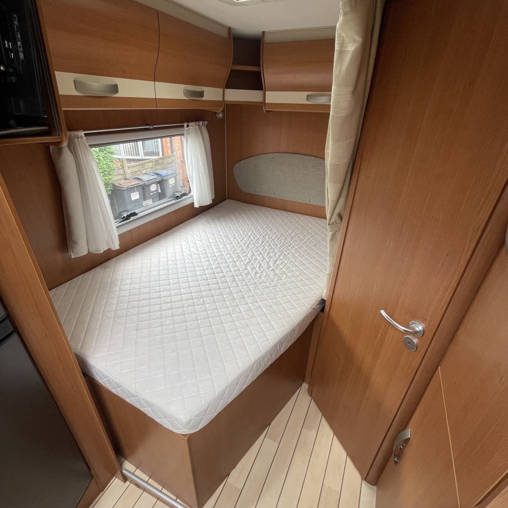 When looking around this motorhome you get one of the most popular layouts there is on the market. If you start at the back of the motorhome you have the classic fixed french bed configuration and adjacent wash room. The fixed French bed has plenty of room for two adults and lifts up giving you lots of storage which is always good in a motorhome. The storage can also be accessed from the outside. Next to the fixed bed you have a shower room and toilet. The shower and the toilet are separated with a shower screen, Inside the bathroom there is storage and vanity mirror. Moving back through the motorhome towards the front you then have a good sized kitchen that has a oven and grill combination, large sink basin, three gas hobs and plenty of storage.
