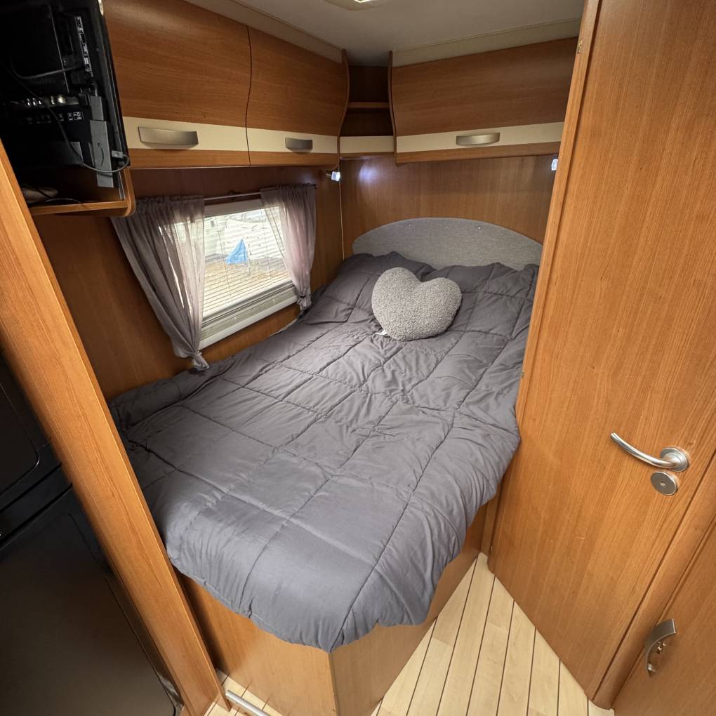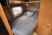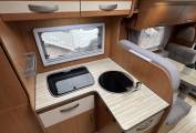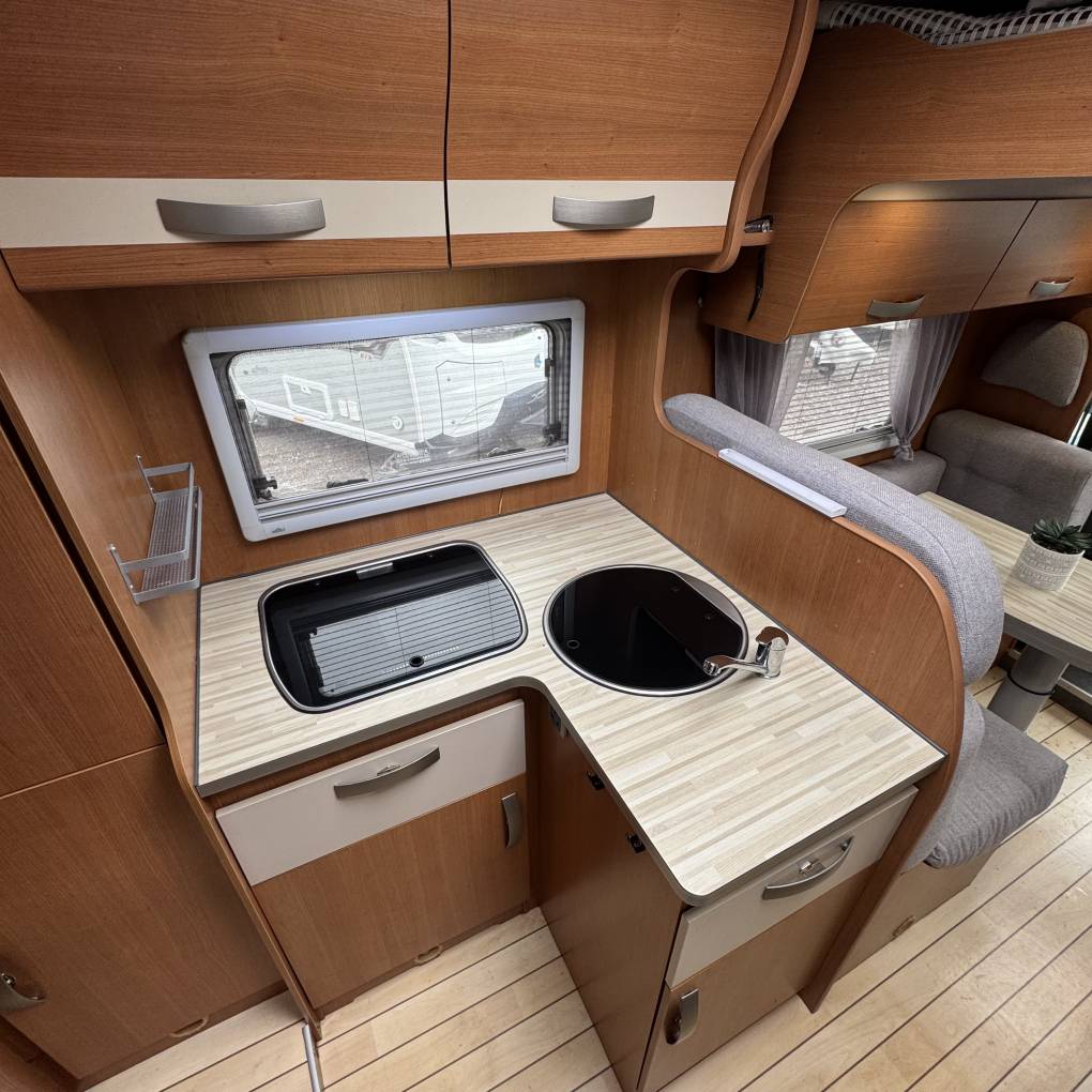 When looking around this motorhome you get one of the most popular layouts there is on the market. If you start at the back of the motorhome you have the classic fixed french bed configuration and adjacent wash room. The fixed French bed has plenty of room for two adults and lifts up giving you lots of storage which is always good in a motorhome. The storage can also be accessed from the outside. Next to the fixed bed you have a shower room and toilet. The shower and the toilet are separated with a shower screen, Inside the bathroom there is storage and vanity mirror. Moving back through the motorhome towards the front you then have a good sized kitchen that has a oven and grill combination, large sink basin, three gas hobs and plenty of storage.