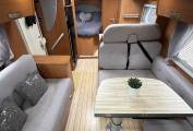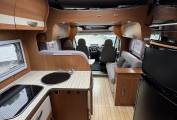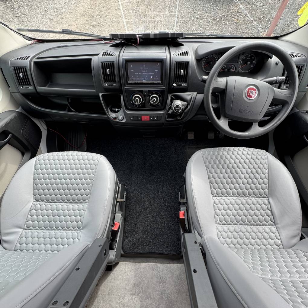 Moving to the dinette area you get more than enough space for five adults. It has a good sized table and offers a brilliant entertaining area with lots of windows giving you panoramic views of your holiday destination. Above the dinette you have a electric drop down bed which creates you a big double for your travelling passengers. At the front of the motorhome you have two swivel seats as well as cab air conditioning.