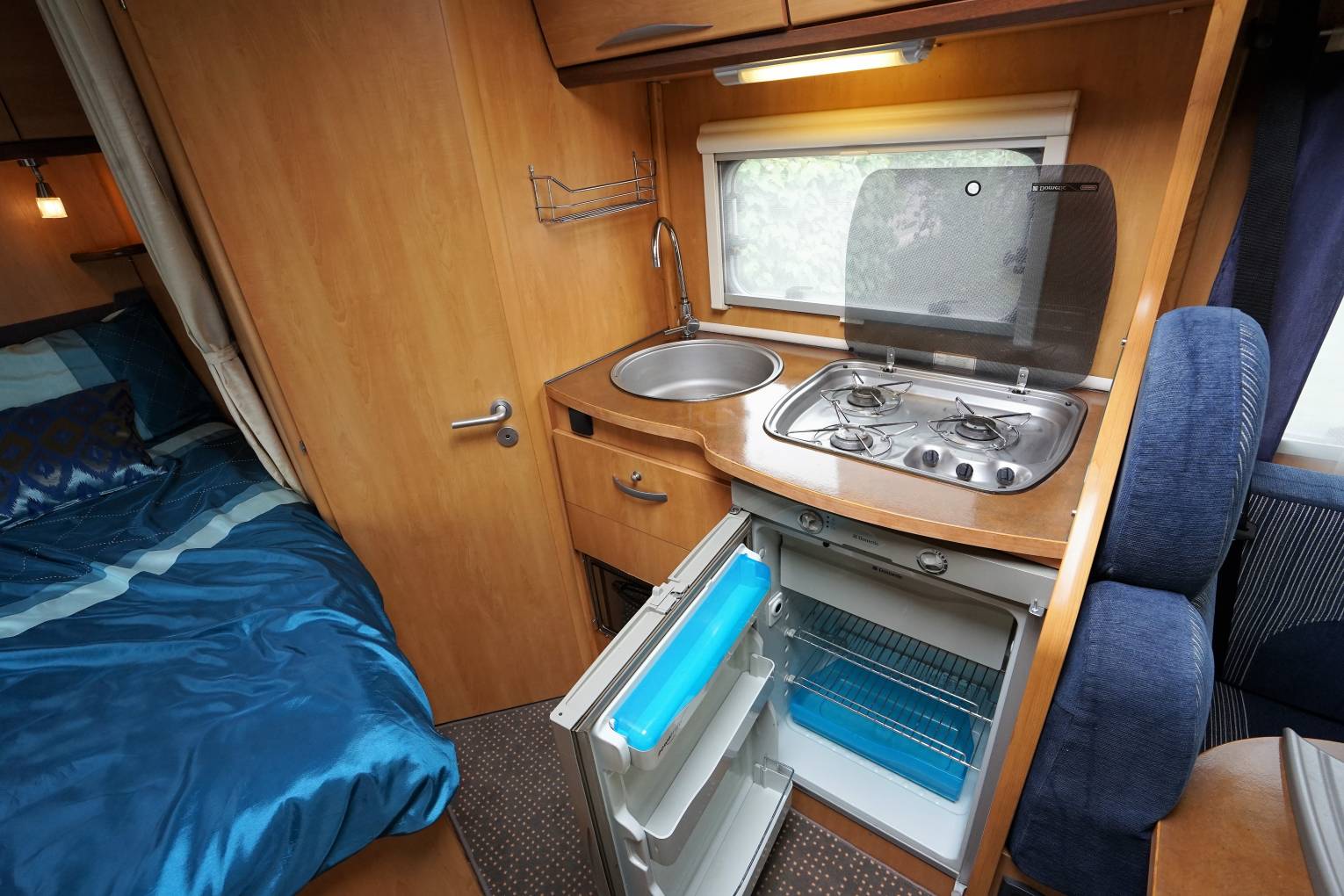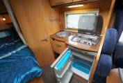 There is a side kitchen area that boasts a 3 burner gas hob, grill, oven and stainless steel sink with mixer tap. 3 way fridge with freezer box Microwave in overhead locker.