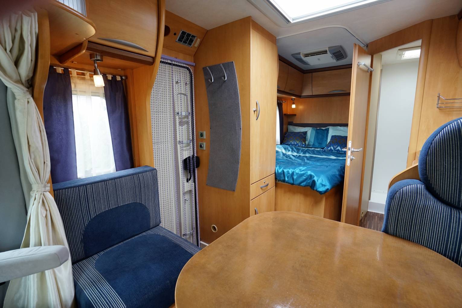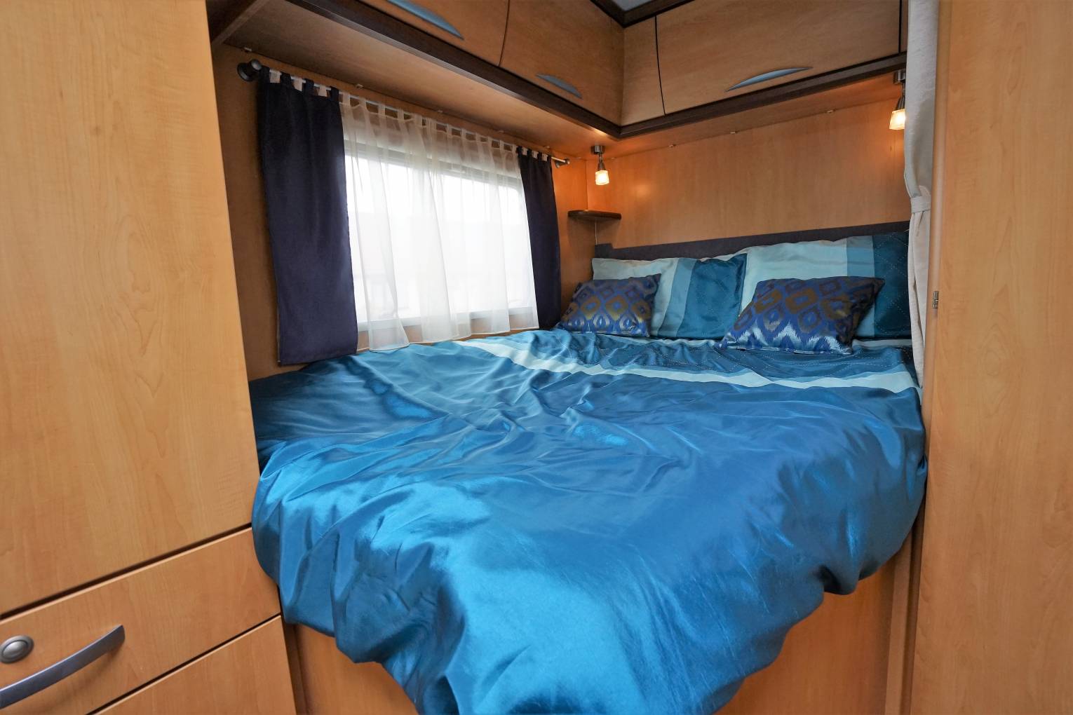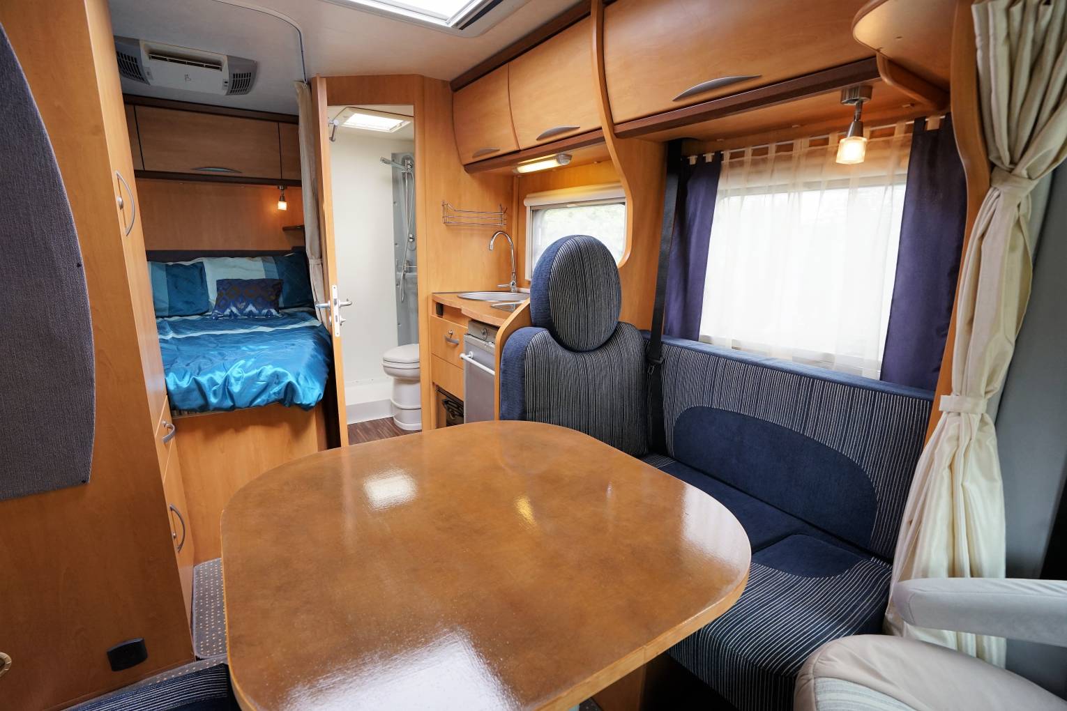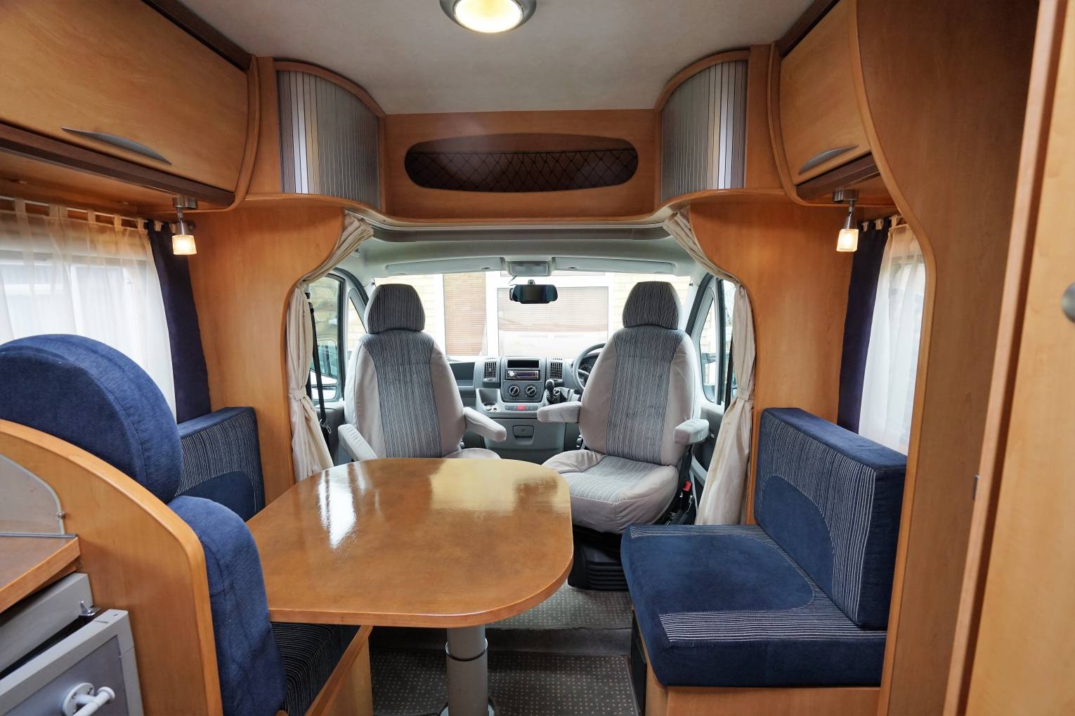 Spacious front L shaped Lounge with Side Sofa and fully adjustable dining table and 3rd rear seatbelt. Both Captains seats swivel to create a family dining area. This area converts into a single bed. Plenty of Overhead Storage.