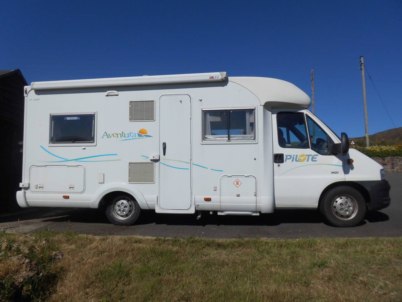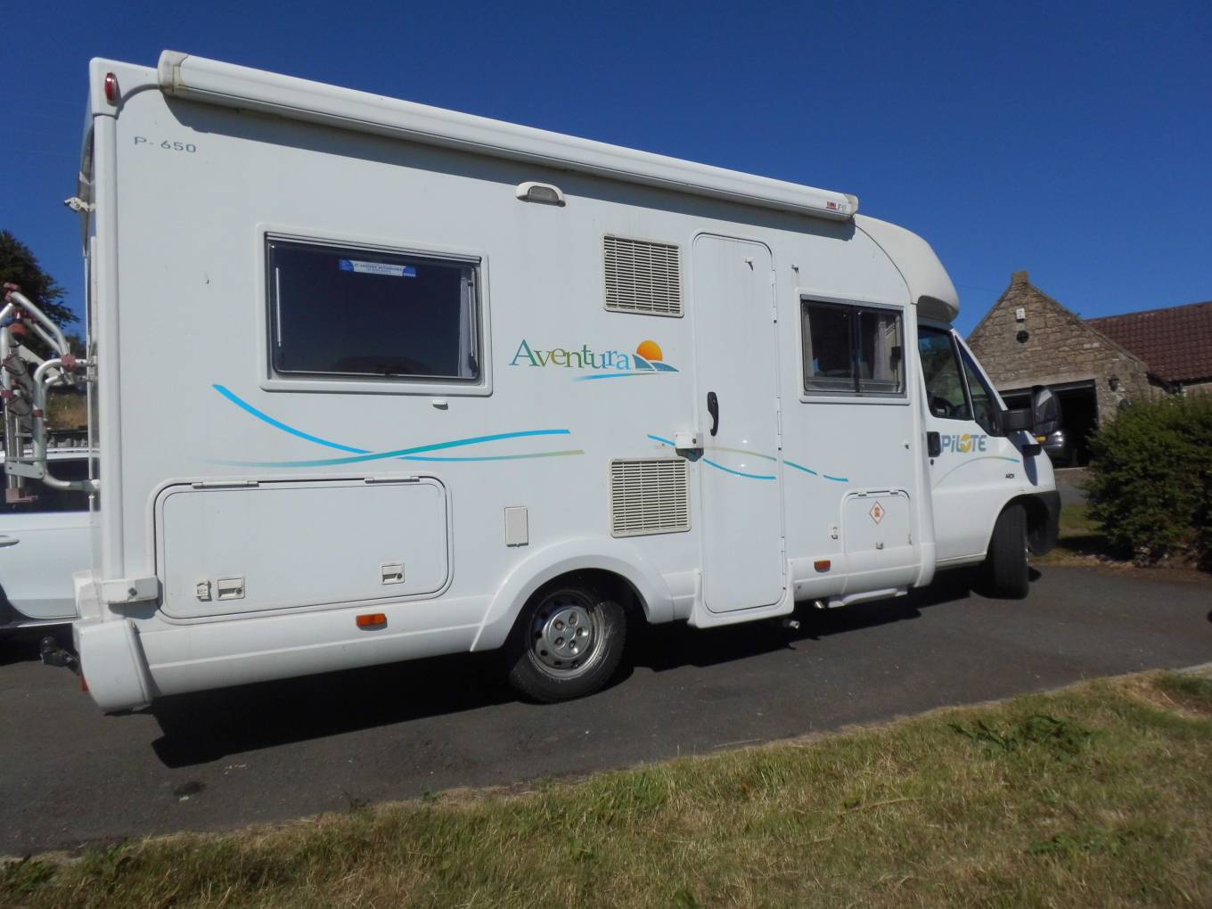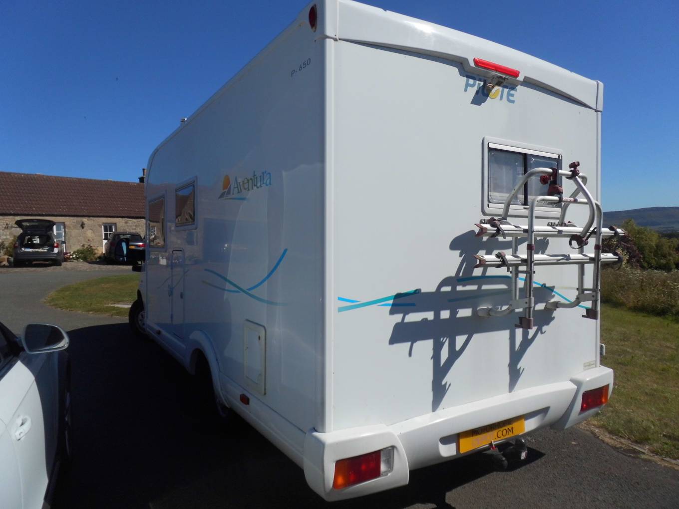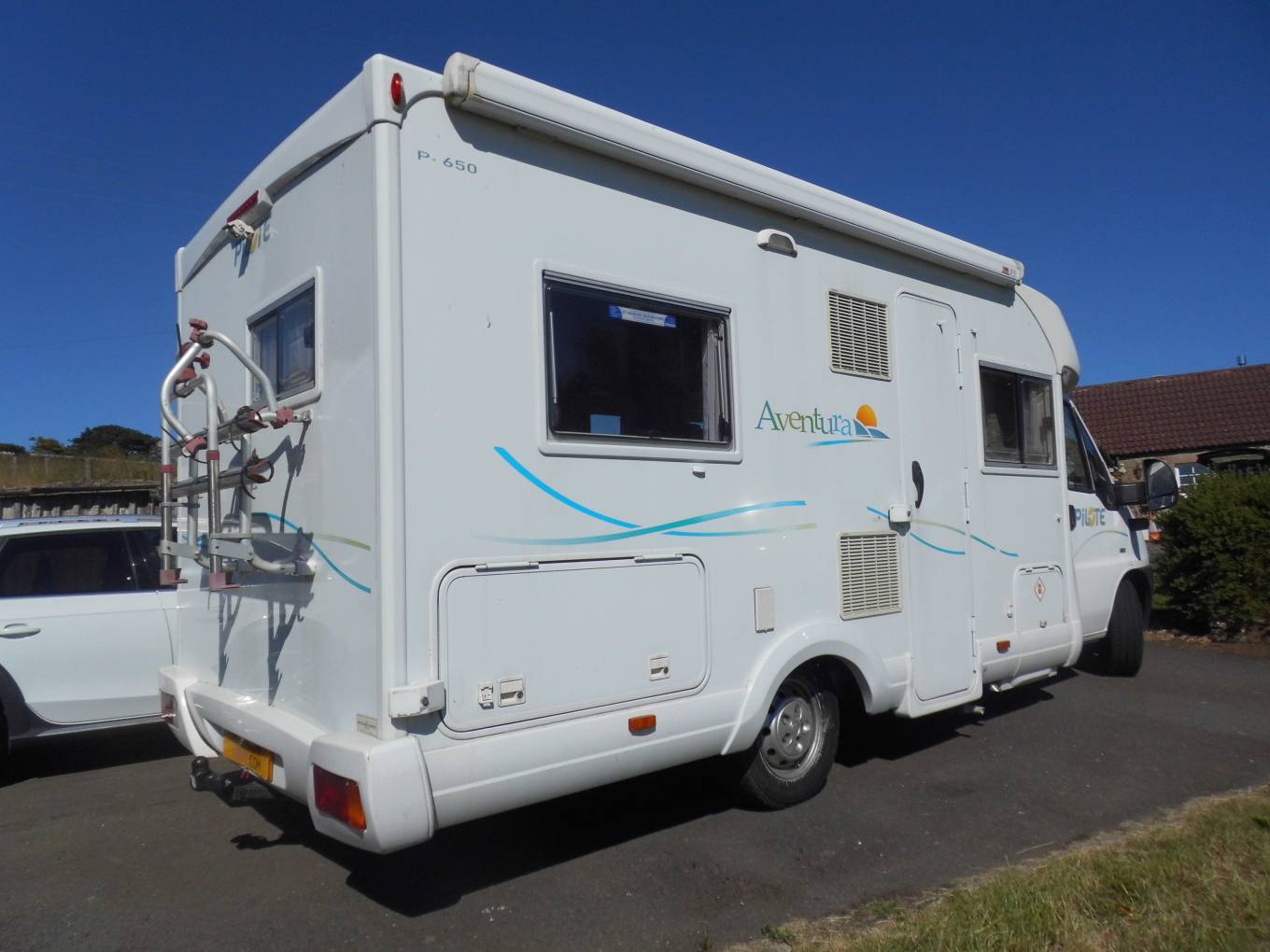 We are presenting a very popular Pilote Aventura P650 4 berth family motor home for sale. The main feature is the rear fixed double bed with large storage locker below. The lounge dinning area has ample space for 4 adults comfortably comprising of a forward facing bench seat fitted with 2 travelling seat belts. Side bench and the 2 captains chairs swivel round to the table which extends. This area also transforms into the 2nd double bed. The well equipped kitchen has a 3 burner hob, oven and grill combined, large fridge, separate freezer and kitchen sink also plenty of cupboard space. Washroom is a good size with a WC, screened off shower cubicle and wash hand basin. Other features include Fianna awning, reversing camera, tow bar, bike rack, external access to the large locker under the fixed bed. New tyres and stainless steel exhaust fitted also a turbotune DT engine management module to improve economy and power. Good service history. For further information please call one of the team on 01324 334 995.
