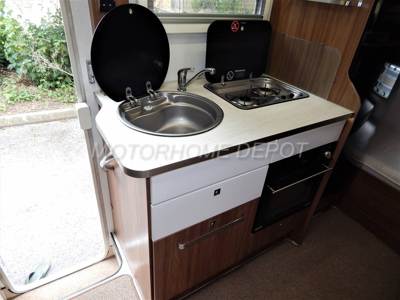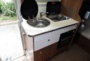 chrome mixer tap; 2 burner gas hob, below is a Thetford Oven and grill.