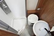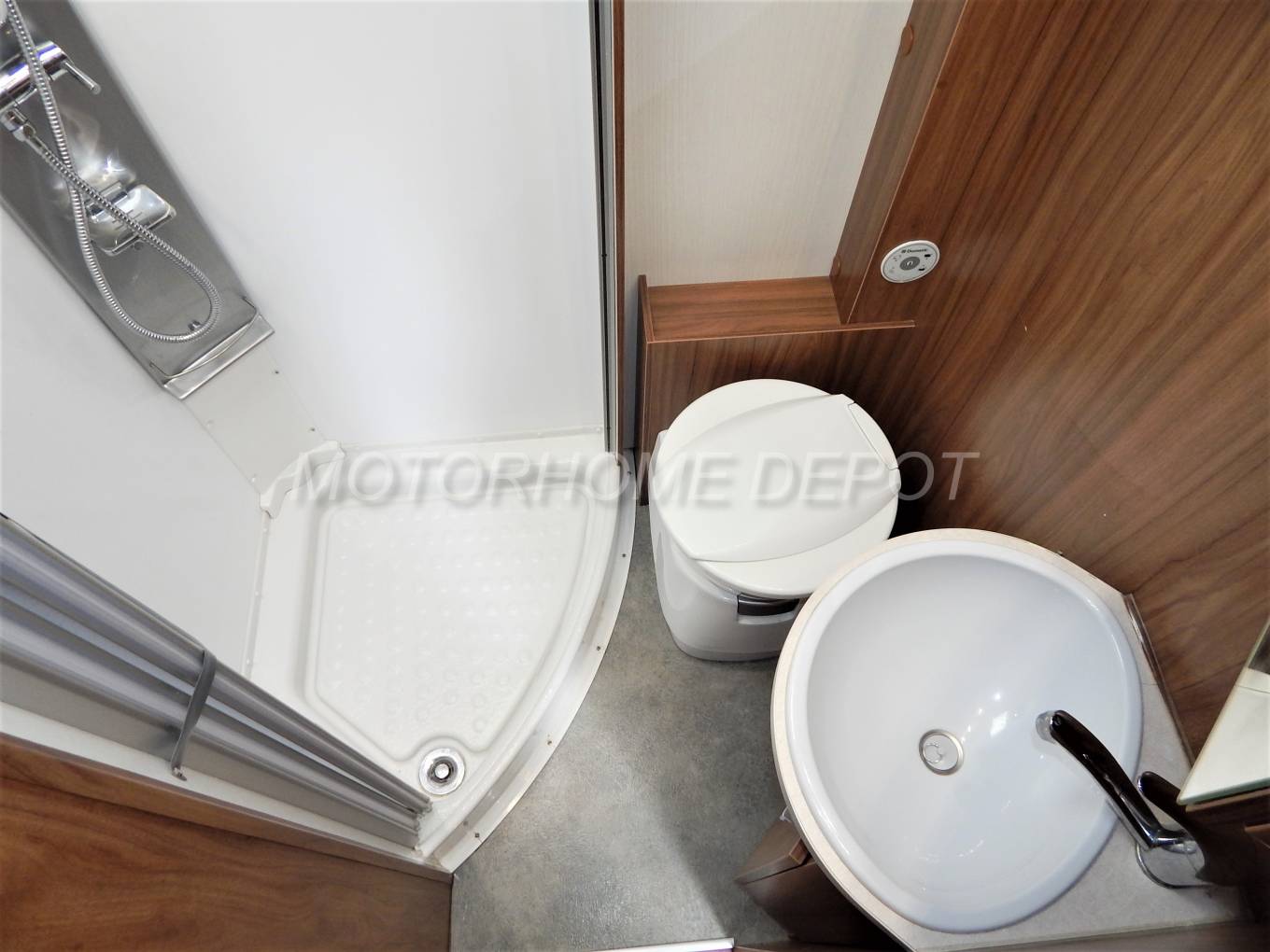 and shower head on a chrome riser; the toilet a Dometic cassette style