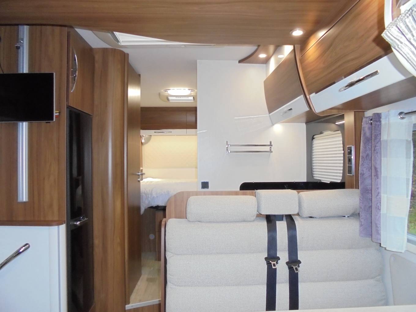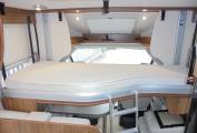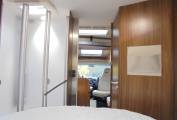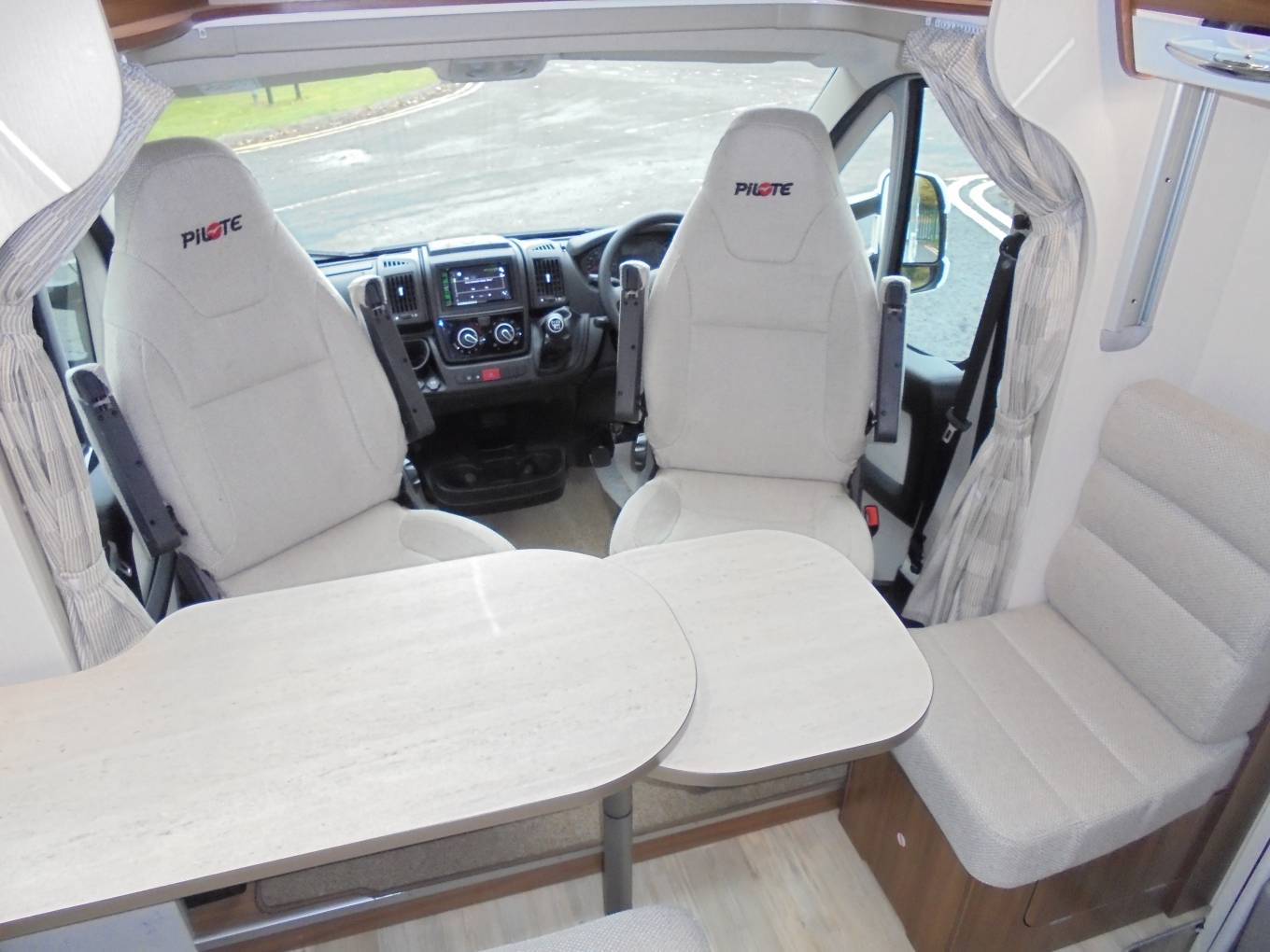 From the rear of this luxurious ,spacious Pilote we have the large island bed with deep wardrobes either side and a large storage area under the bed.Off the bedroom area there are the separate shower and washroom/toilet facilities.At the centre of the motorhome we have the well equipped kitchen which has like the rest of the motorhome been finished with the highest quality polished furnishings.The dinette area behind the front two captain swivel seats has a forward facing bench seat incorporating the other two travelling seat belts.The electrically lowered bed is also situated in this area and can be used in conjunction with the third bed in the dining area.