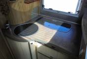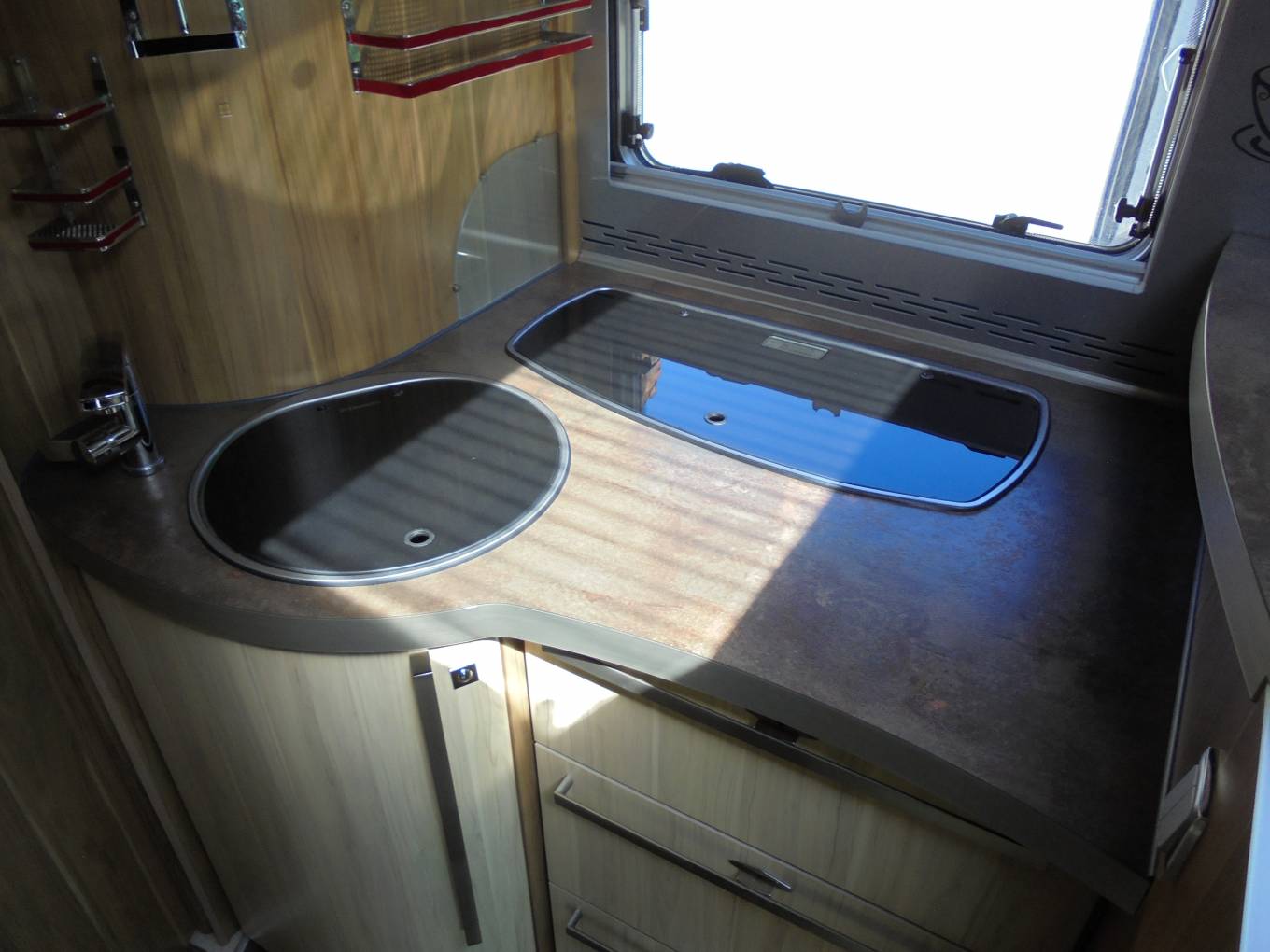 The kitchen is equipped with a 3 burner hob, sink, grill/oven and state of the art Dometic RMD 10 series fridge which was added in 2019 at a cost of £2500, both the freezer and fridge doors can be opened from either side.