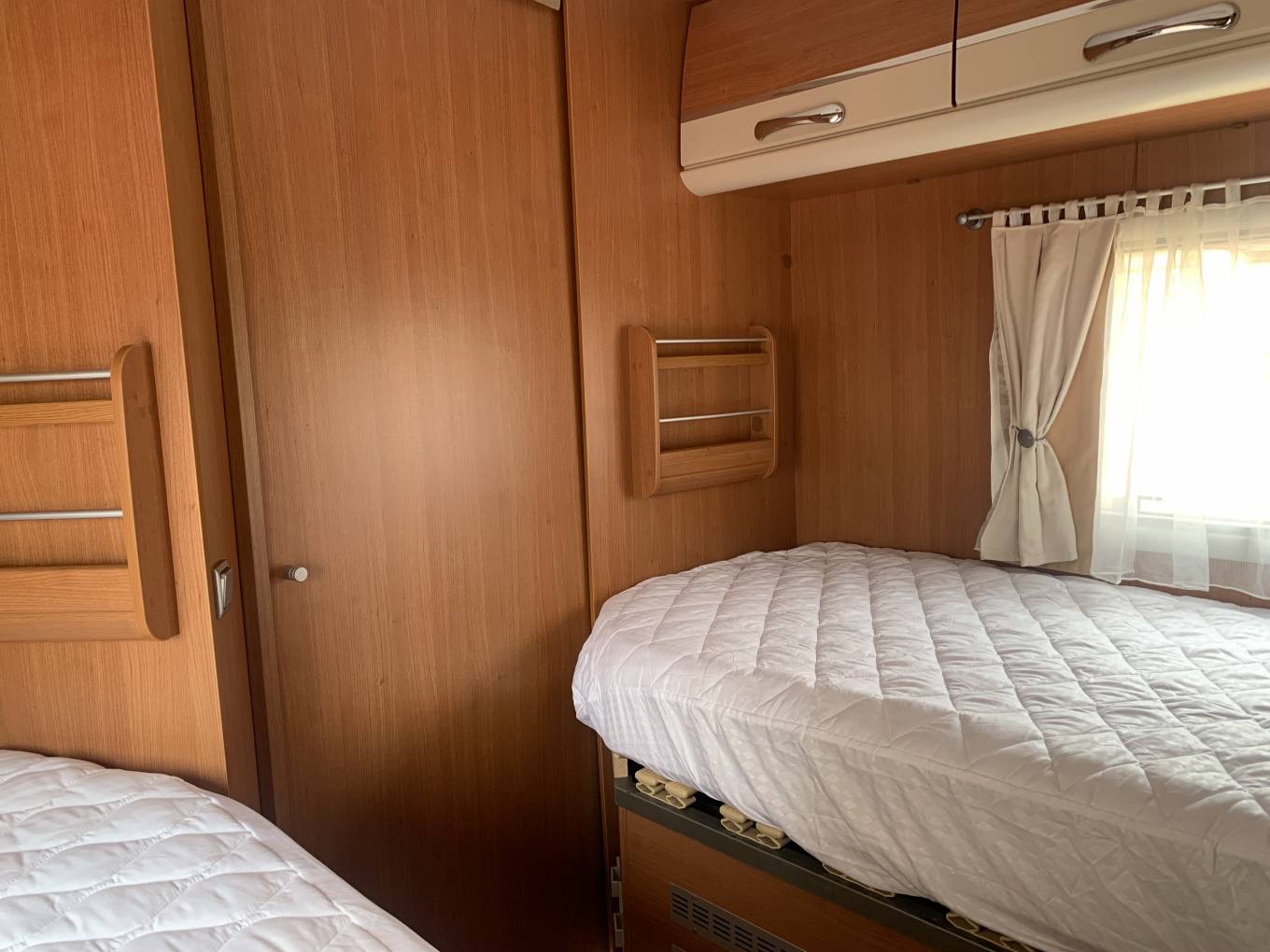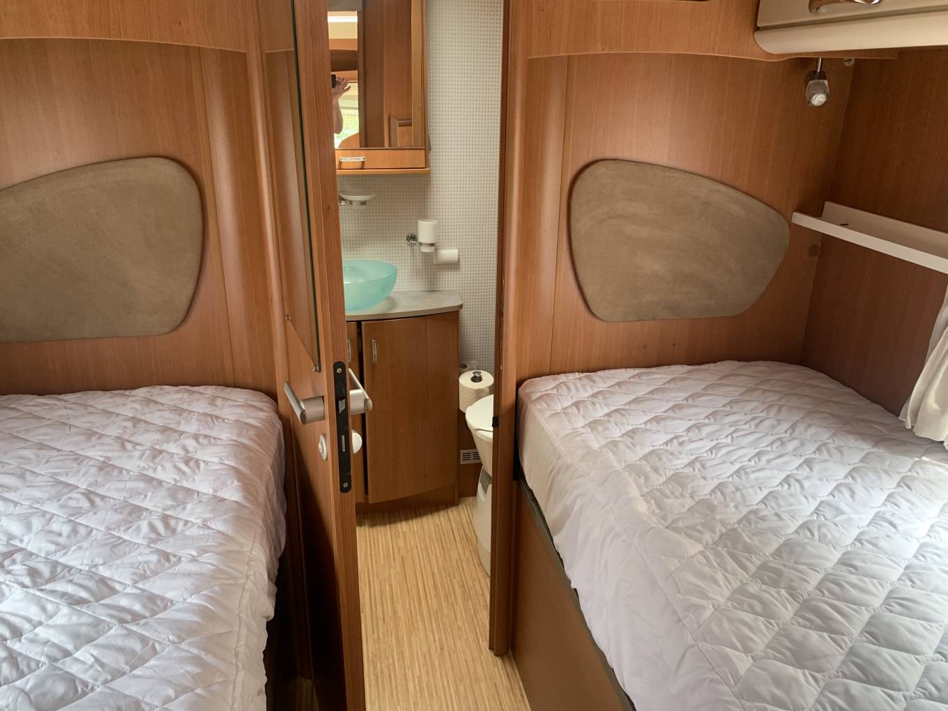 width rear washroom behind a spacious bedroom with two fixed single beds giving the feel of a comfortable hotel room.