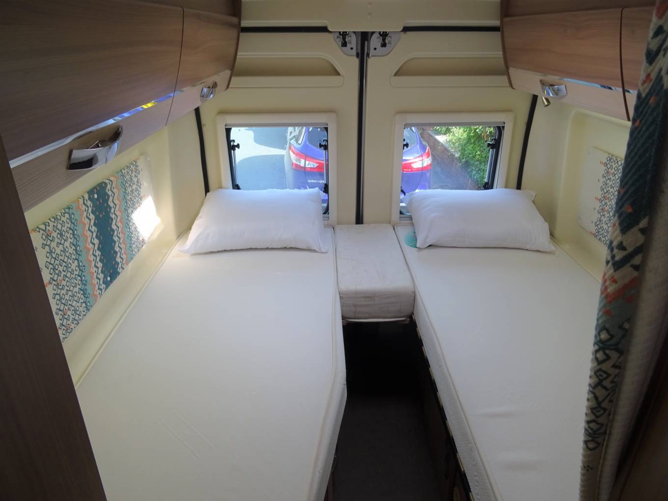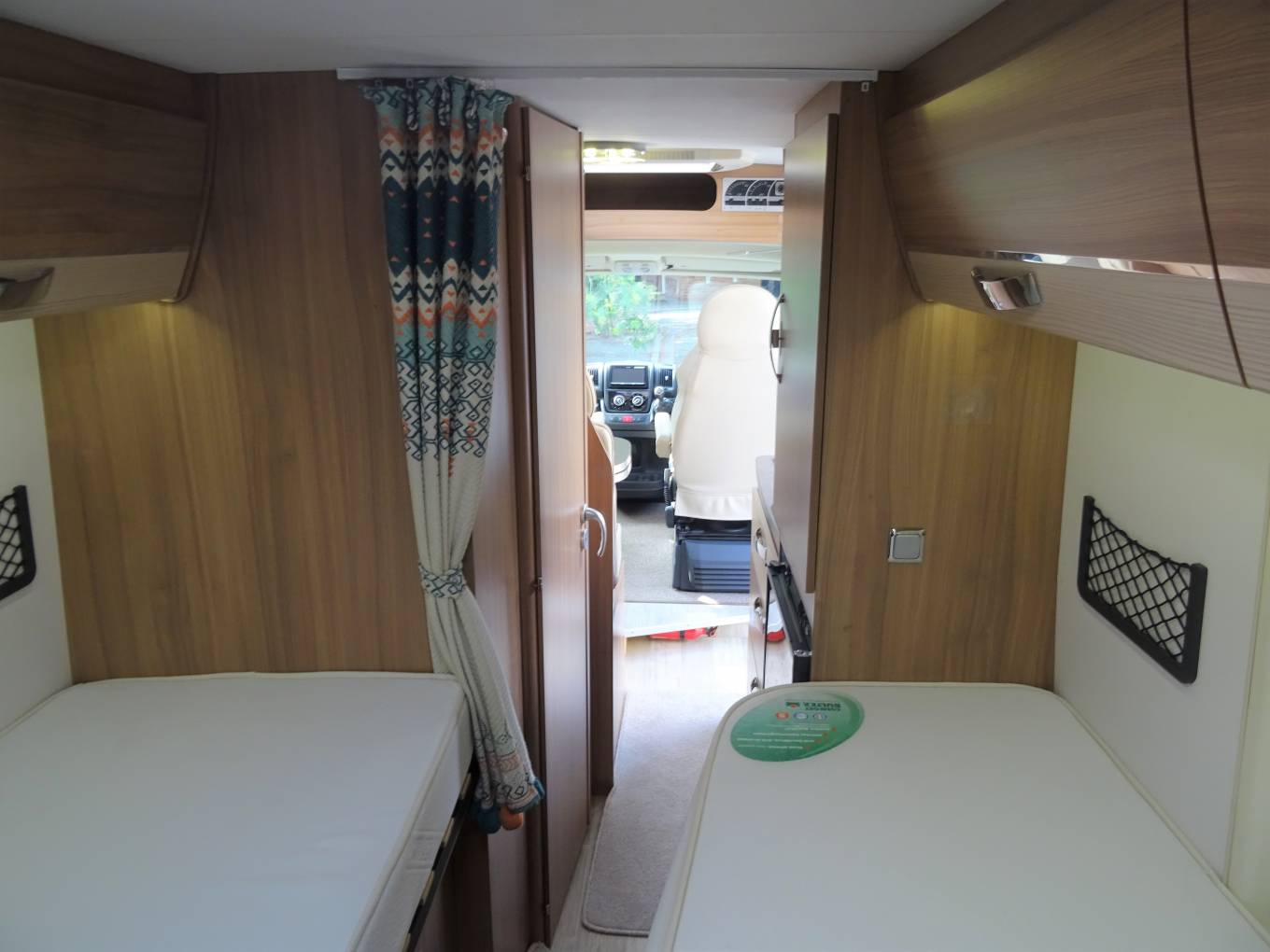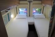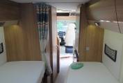 Starting with the rear of the motorhome, you have the rear fixed single beds which are surrounded by multiple spot lights with plenty of storage space in the overhead cupboards and can also be closed off from the rest of the motorhome by curtain that pulls across. Underneath the bed is the Gaslow system along with plenty of further storage including the location of the 2 leisure batteries and Bestek Inverter.