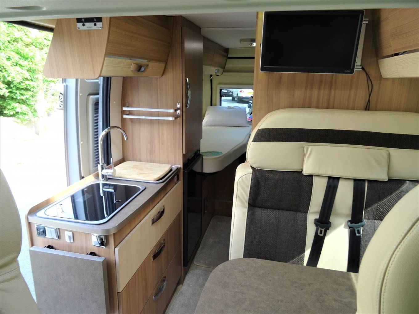As we head towards the front of the motorhome, we come to the lounge/dining area where there are the rear two travelling seats along with the dining table that also extends to accommodate the driver and passenger seats that both swivel to face the dining area and to also face the well positioned flat screen Avtex TV. In the cab there is air conditioning, state of the art Pioneer touch screen interface which includes bluetooth phone, Apple car play and the screen for the reversing camera which comes on automatically. There are also electric windows and mirrors.
