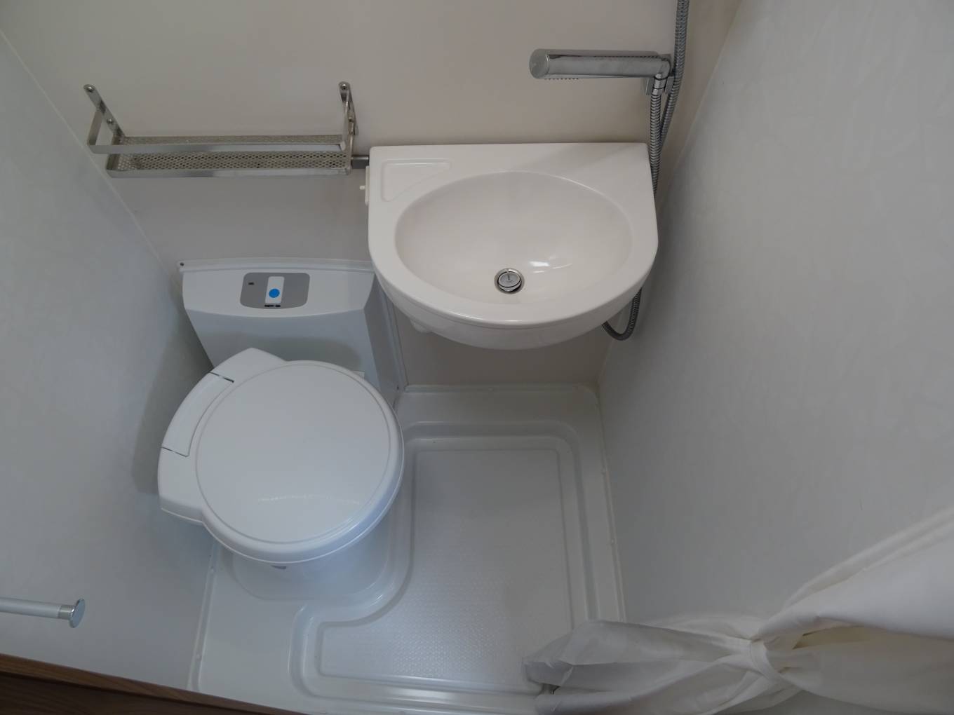 Moving through to the centre of the motorhome is the washroom which includes a shower, wash basin with mixer tap, cupboards and a separate Thetford toilet with further storage units. Adjacent to the washroom is the Dometic 3 way fridge with freezer compartment and wardrobe located above.