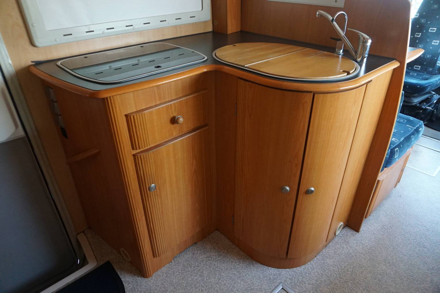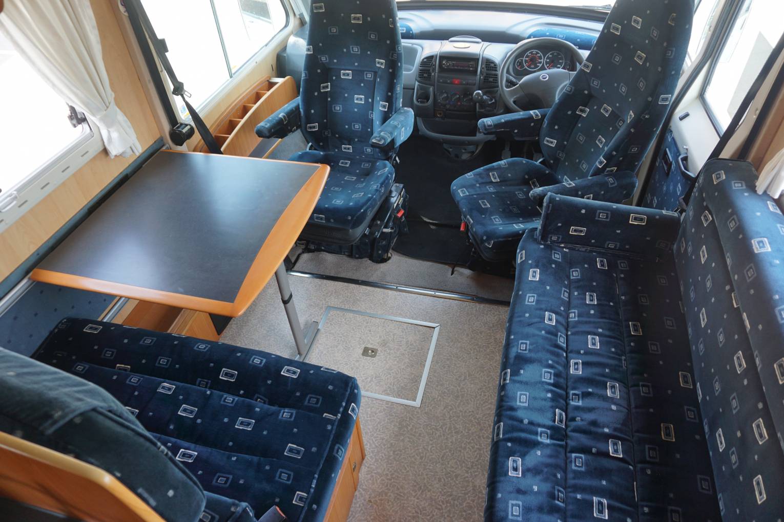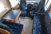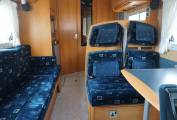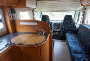 Behind the cab is the gorgeous light and airy lounge dinette. Here you have a forward facing 2 seater sofa fitted with 2 seat belts and on the opposite side is a long sofa. There is a study dining table for your meal times and as both front seats swivel you can sit 4 to 6 people around the table. At night time the sofa and table convert into a double bed and the long sofa can also be used as a single bed giving you 5 berths in total.