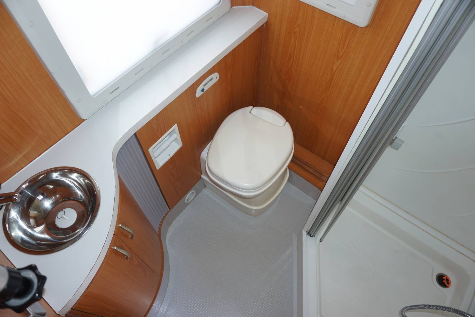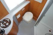 If you enjoy cooking then you are well catered for in this lovely Pilote. There is a Smev oven and grill, a 3 gas burner hob, a Dometic 3 way fridge freezer with automatic selection, a sink with a mixer tap and numerous cupboards and drawers for storage. Then at the rear you have the excellent bathroom with a separate shower and perspex screen, a Thetford cassette toilet, a wash basin with a mixer tap, a mirror and a storage cupboard.