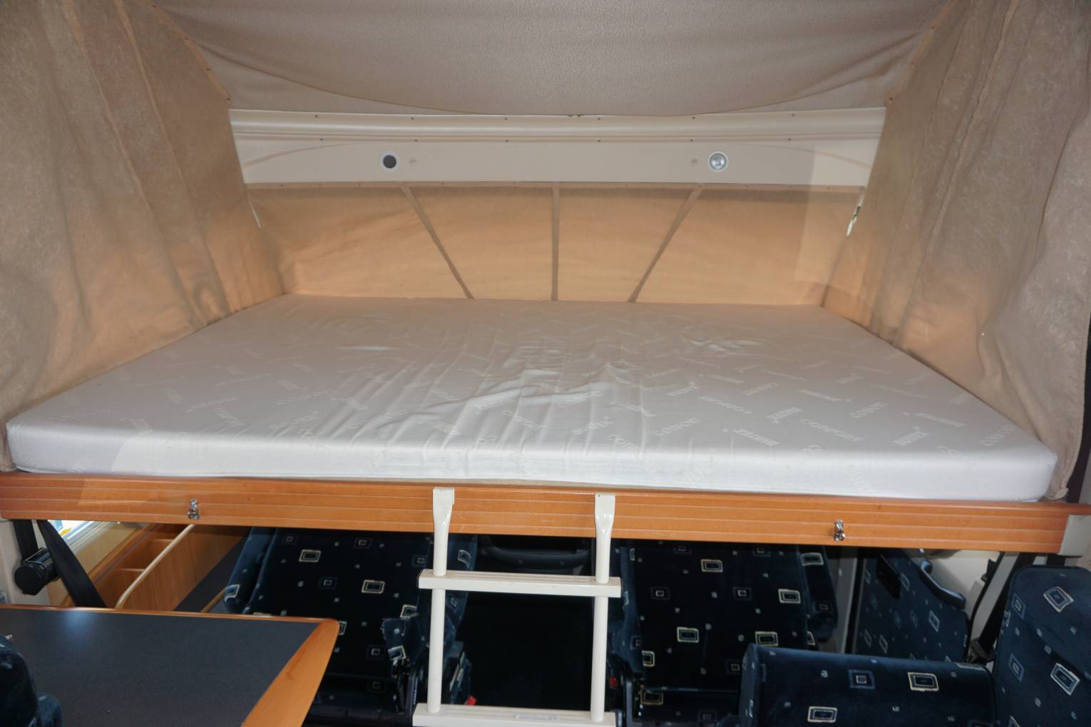 Based on the class leading Fiat Ducato chassis this motorhome has the powerful 2.8 litre engine so climbing hills won't pose any problems. In the cab you have air conditioning, a radio cd player, 2 swivel seats and some storage space. Above the cab is a cavernous pull-down bed that will sleep 2 adults in real comfort. Once you wake up the bed is raised back into the roof leaving you plenty of room to move around your motorhome.