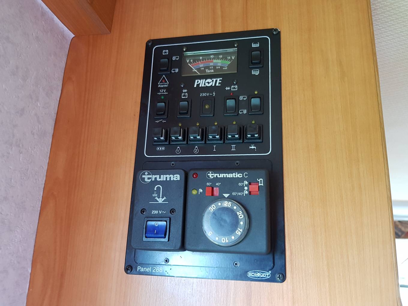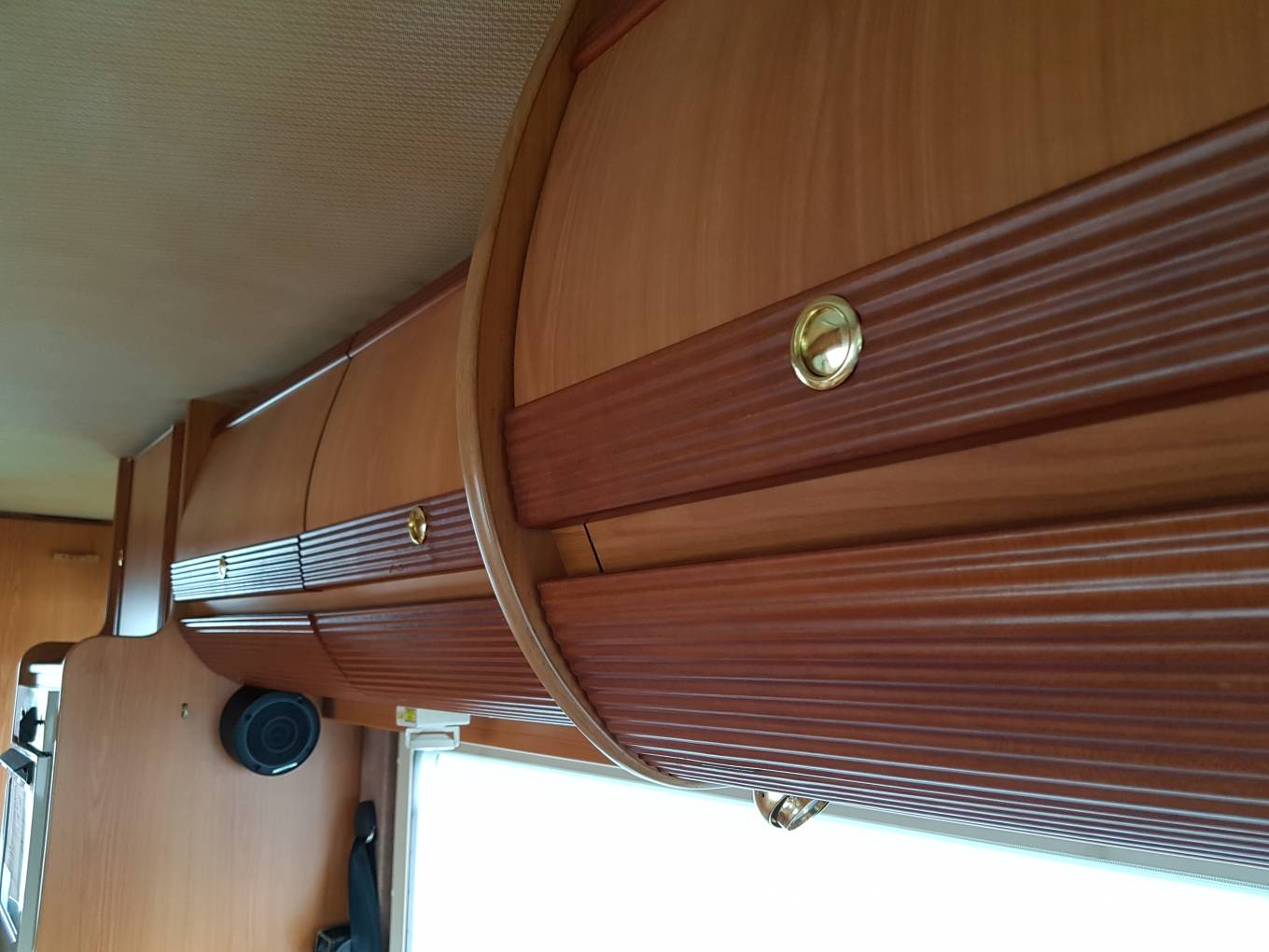 The owners previous to the present owner were heavy smokers. Whilst all smells have been banished there is discoloration to the ceiling which would benefit from being recovered. Some curtains have also been removed for the same reasons. All in all, easy to remedy. There is a solar panel to trickle charge the vehicle battery. All of the windows, catches, blinds and fly screens work as they should. The upholstery and cushions are clean and firm respectively. The cab is a bright airy place to be with the large screen. There is a newly fitted and wired towbar for the A Frame. The 2.5 litre turbo diesel engine is by Peugot. The length is 22 feet six inches, and width is 7 feet 8 inches which does not include mirrors. These measurements correspond to approximately 6.9 and 2.4 metres. A reversing camera with in cab monitor is fitted and working. There is a self tuning satellite system installed. There are numerous above and below shoulder height cupboards and storage options as well as under seat space too.