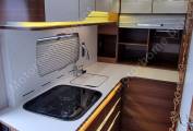 Not having a fixed bed means this motorhome can boast a generous-sized L shaped kitchen with lots of both worktop space and storage which includes deep drawers, a condiments shelf, two bins and a second rack for four bottles. A tambour door hides yet more practical shelved storage. Opposite is a full size fridge/freezer as well as a microwave, and grill/oven. The hob has 3 burners and the sink lid removes easily for access.