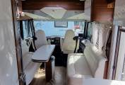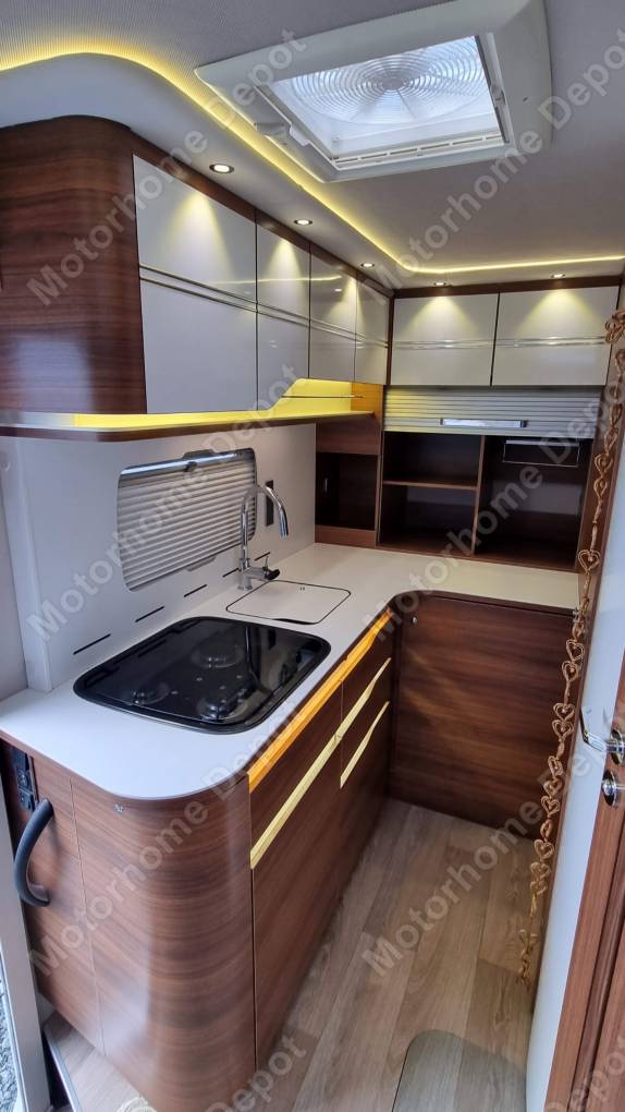 In the lounge, you will find long comfy settees which are matched around the table with the swivelling captain seats in the cab. You will also find an adjustable TV bracket and a flat floor throughout this beautiful motorhome. The table twists and folds in half and slides along rails in the floor. You can always place the table away or place it in the perfect position for any meal during your travels, and with a pull-out wine rack under the table what is not to like?.