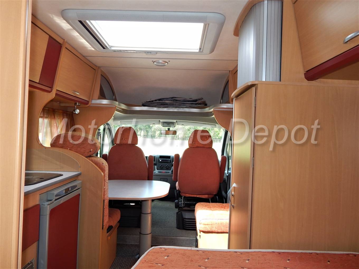 We enter the Motorhome on the drivers side immediately to the right is the dinette which consists of s Side seat next to the habitation door, opposite a forward facing single seat with a 3 Point Lap & Diagonal seat belt for a travelling passenger. The table is centrally fitted and can move to suit how many you are entertaining. The front two seats rotate to join the area so you could easily seat 4 for dinner. If you have a guest staying the table can drop down to form an occasional single bed.