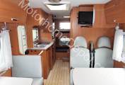 Moving forward and entering the lounge-dining area there are 2 tables with dining for 6. One double seat has 3 point seat belts and the other has two lap straps. This area can be used as a double and single bed. On the wall is a TV which will store away in the cupboard above. There are storage lockers above and the habitation windows have blackout blinds and fly screens
