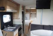 Moving through to the centre of the motorhome, we come to the kitchen area where there is a 3 ring gas hob and Thetford oven supplied from the gas bottle located in the exterior storage unit. Next to the cooker is the sink with mixer tap as well as the full length Dometic 3 way fridge with freezer compartment. There are also several drawers and cupboards for cutlery and cooking equipment.