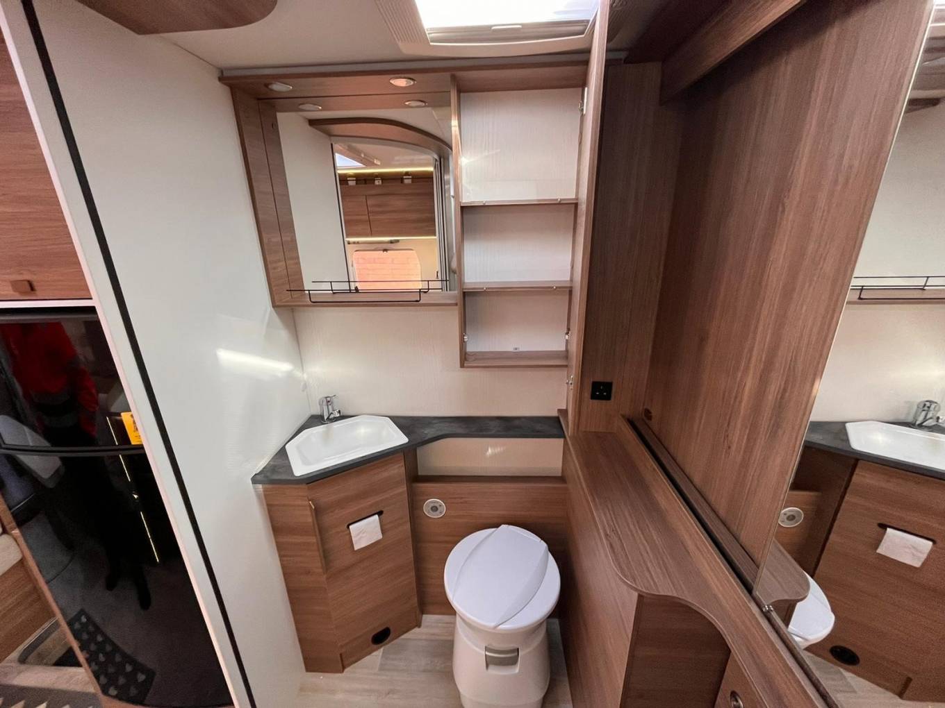 is a wall-to-wall bathroom with a large separate shower, sink, cassette toilet and