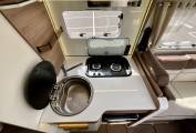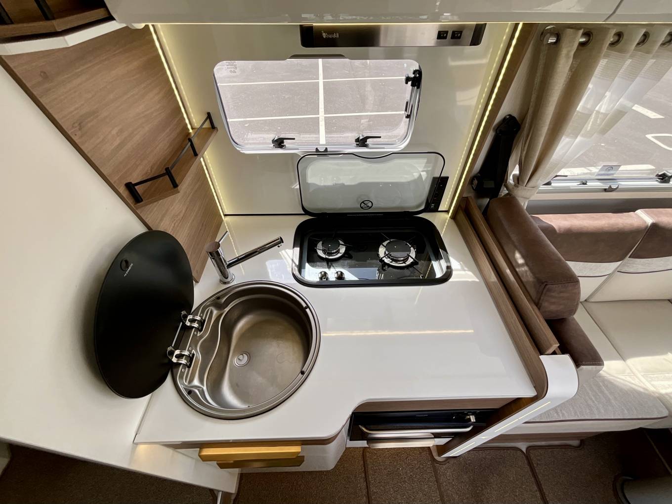 The kitchen features everything the travelling chef needs, including a large 3-way fridge, gas hobs, grill and oven, and sink. There is plenty of storage for condiments, crockery and cutlery.