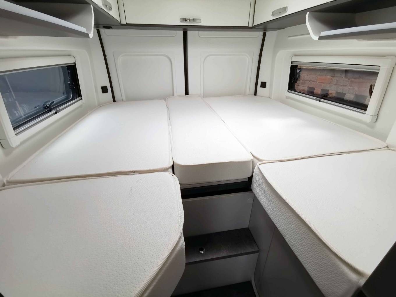 Twin rear beds can flip up for loads of additional space. Beds suitable for people up to 6’3” in height.