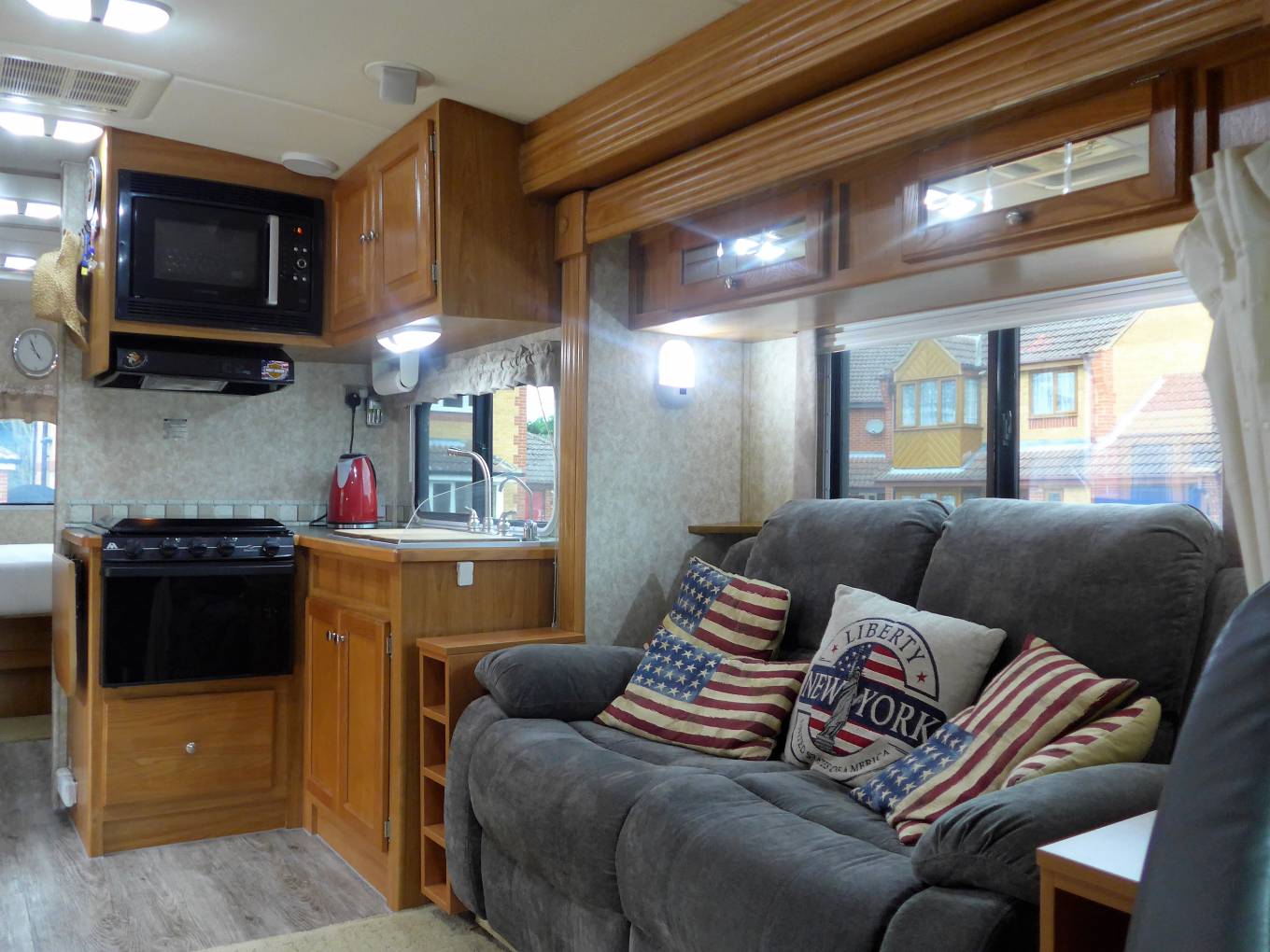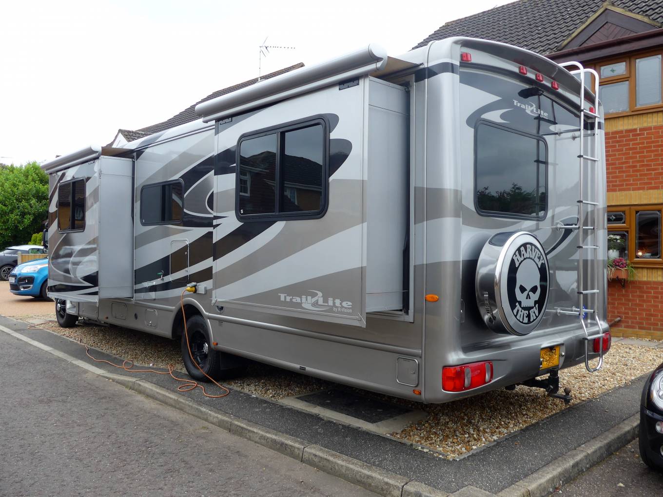 R-VISION TRAIL-LITE 293TS TRIPLE SLIDE-OUT – 4 to 6 Berth RV with 3 Slide outs, LPG conversion, Island Bed, Separate shower based on the Left-hand drive Chevrolet Workhorse chassis cab with 4 speed Auto and 6.0-litre V8 petrol engine (with LPG conversion) producing 345bhp and just 19,918 miles.Twin Rear wheels. 6804 kg so can be driven on a standard pre 1997 driving licence. 29ft 3in in Length. Sort after black & Silver gel coat paint option.
