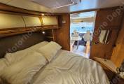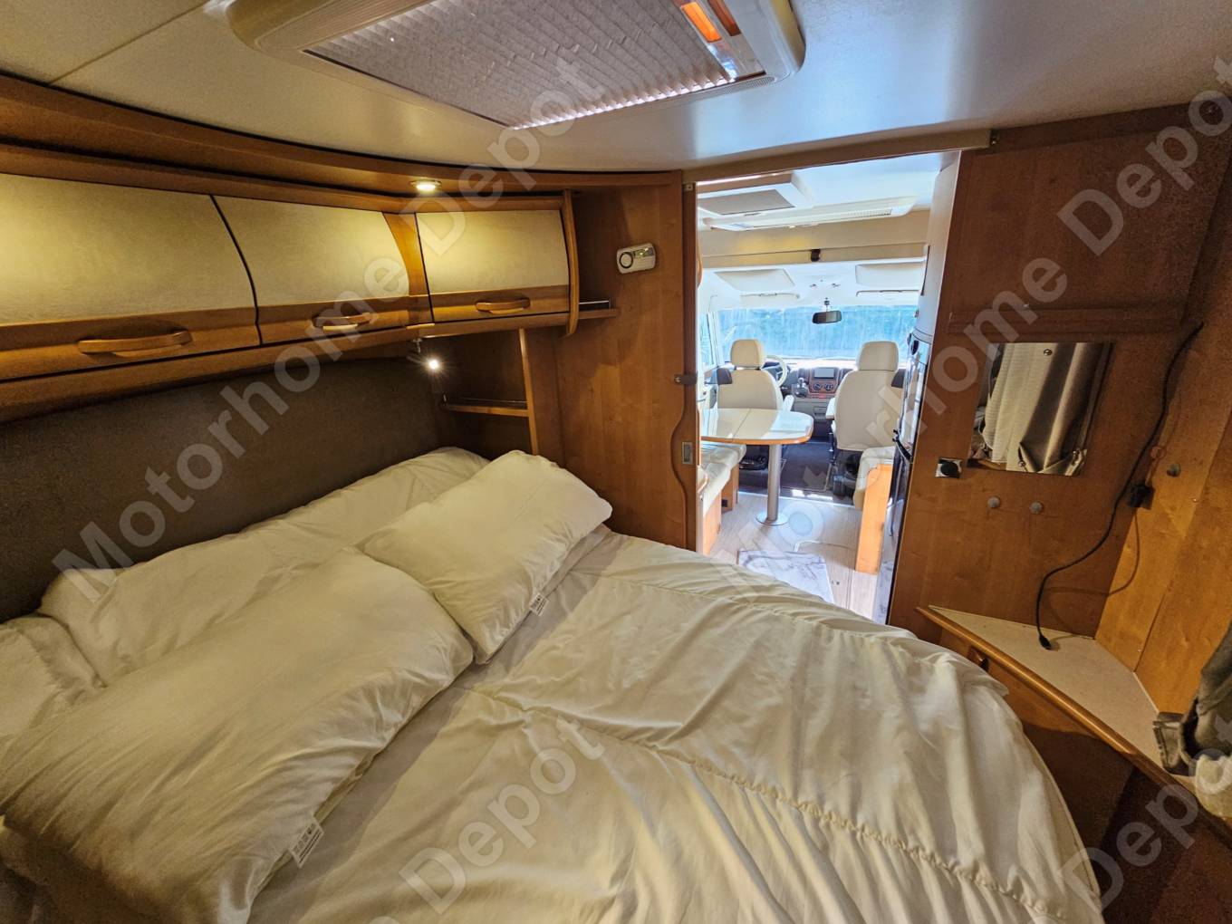 A fixed walk-round double bed in the back and a drop down over-cab double bed in the front with a dividing door between the two.