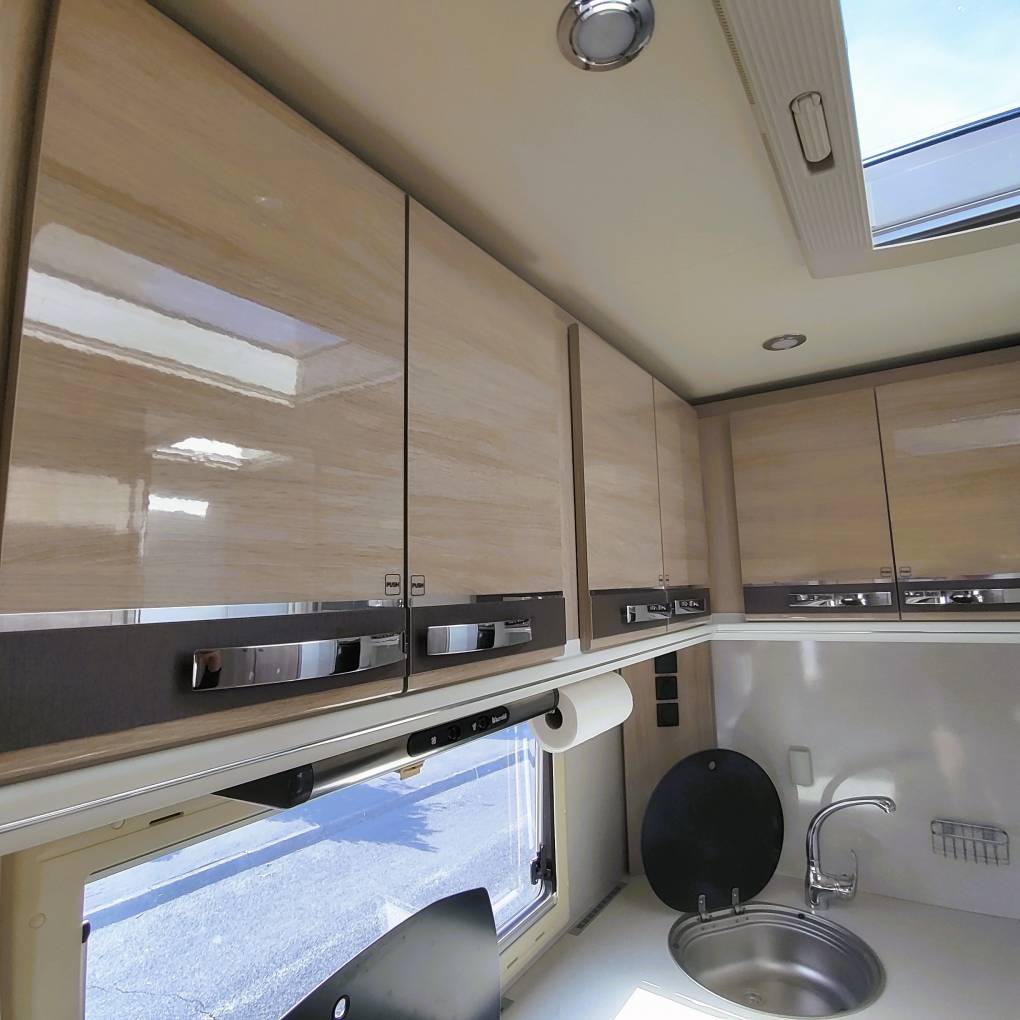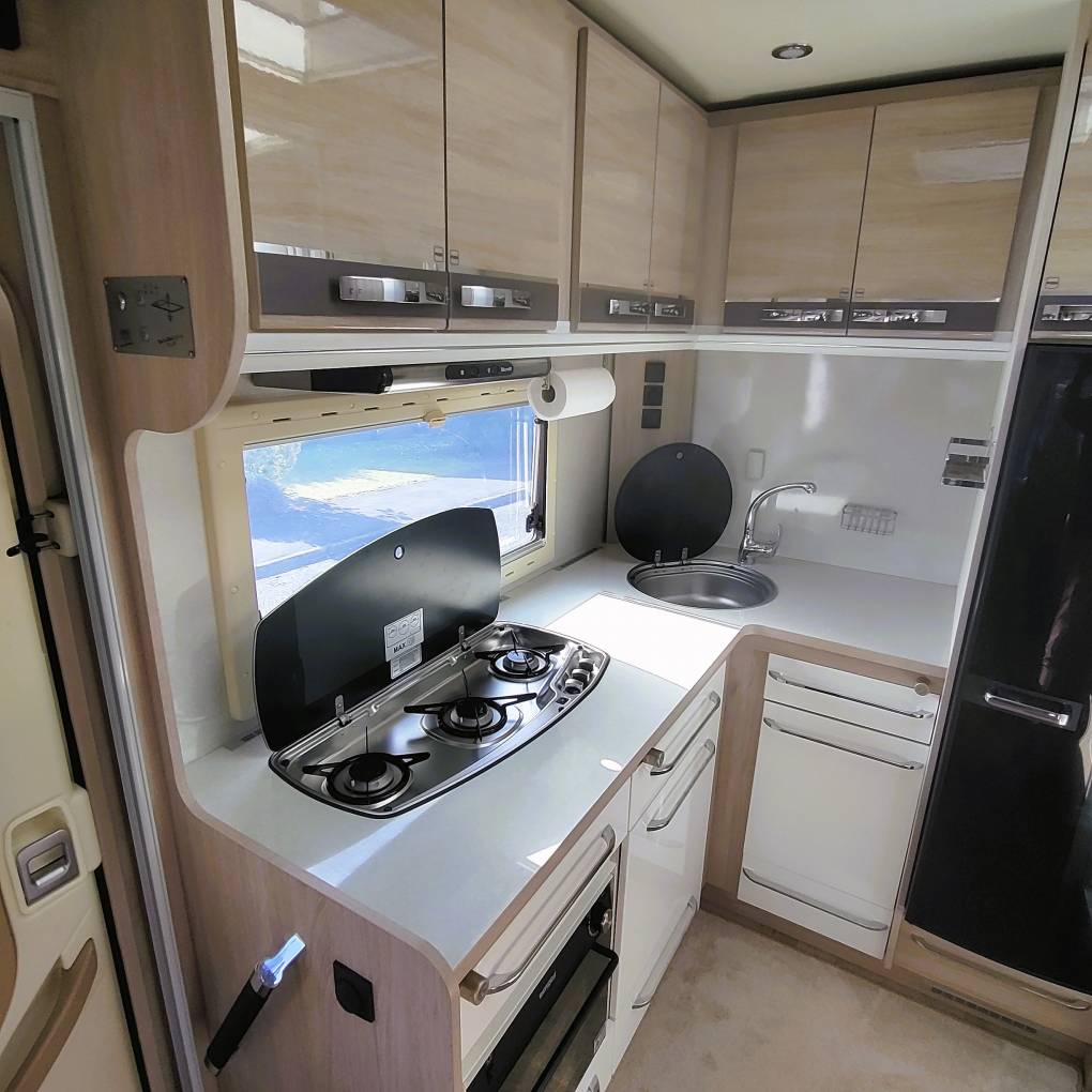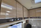 Unmarked leather upholstery, spotless kitchen and washroom and lovely gloss cabinetry married to practicality and great storage. Shower point in garage section. Garage section accessible from inside and outside the motorhome.