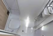 The washroom is pristine and there is a recessed shower tray in what is a wet room, with a pull down sink and storage cupboard above it. Fold out perspex screens to the shower for convenience in use.