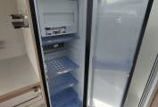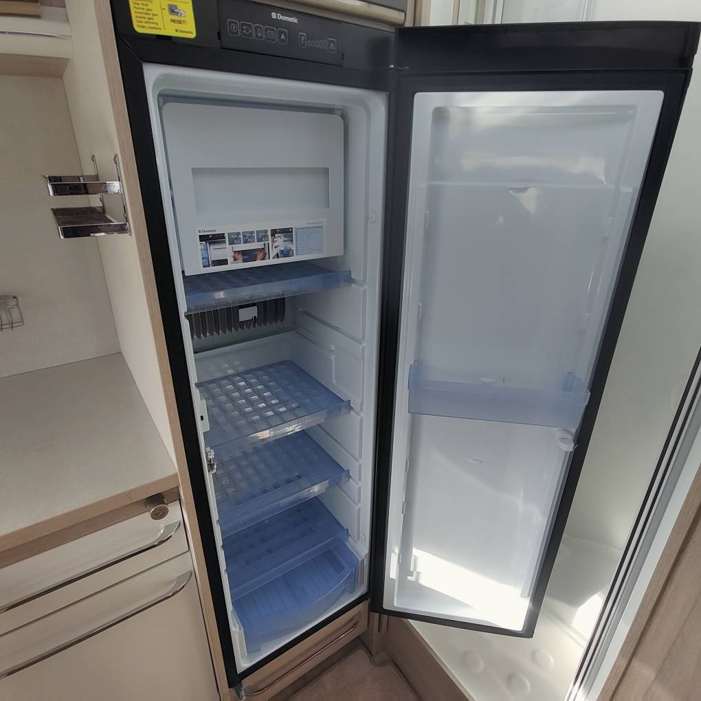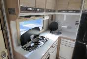 The kitchen offers a hob, grill and oven and a tall fridge freezer for operation on 12 V, gas and mains. There is gas and electric space and water heating.