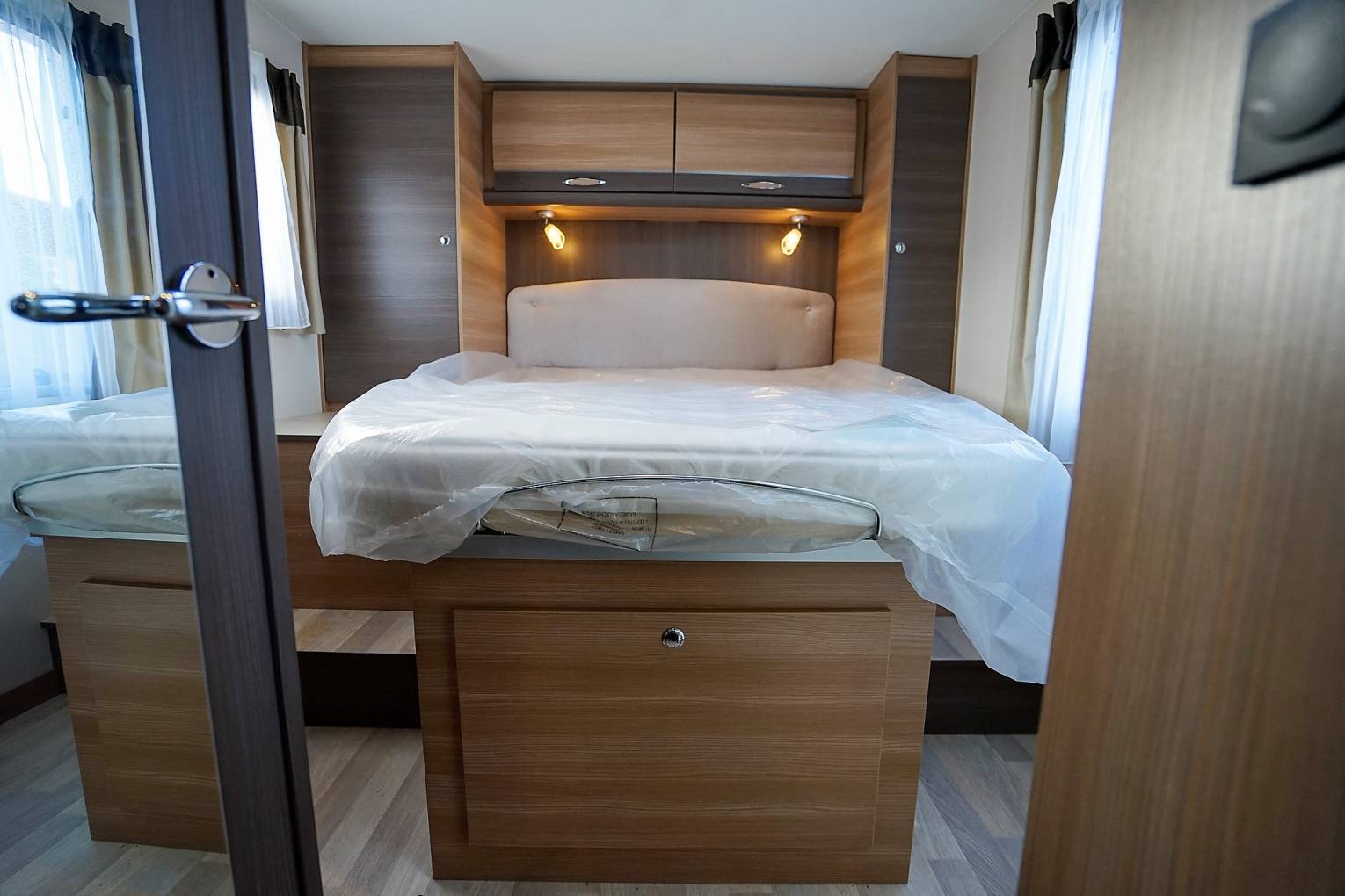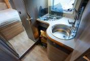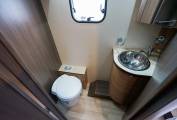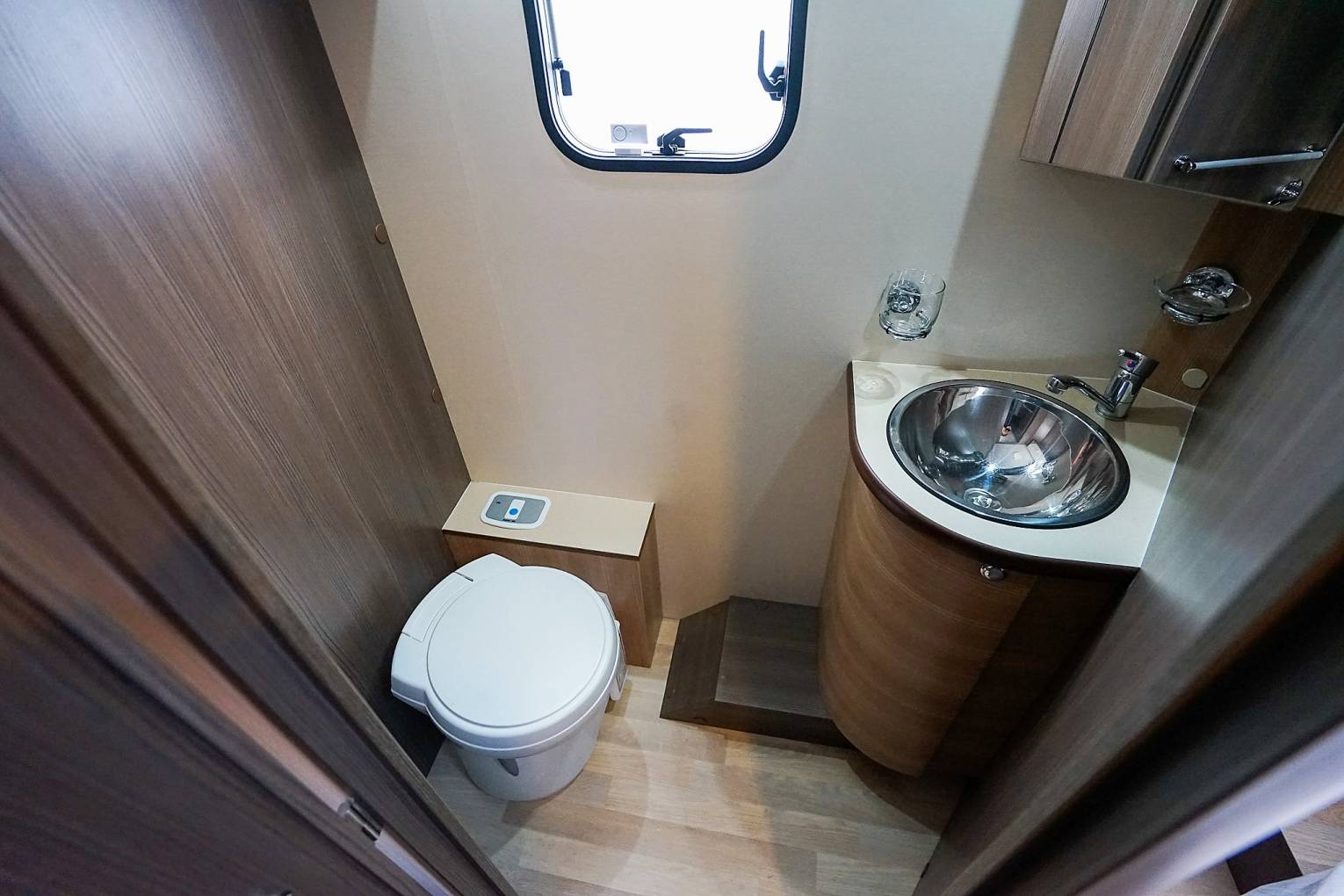 To the foot of the Island Bed you will find the separate washroom with Thetford cassette toilet, vanity unit with washbasin and storage cupboards. Opposite is the separate shower cubicle.