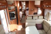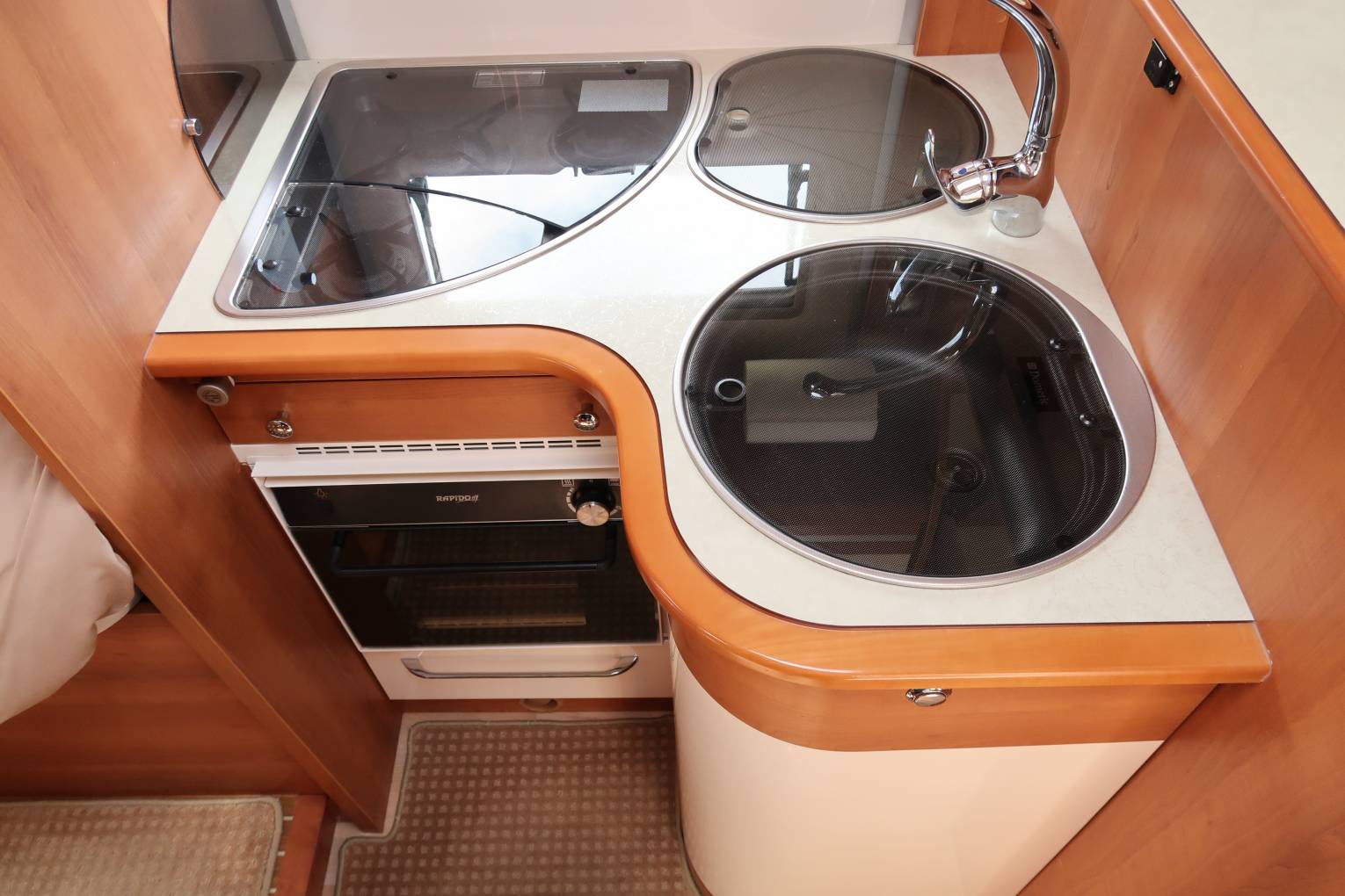 The mid-kitchen is impressively equipped. There is a gas oven and grill, a 3 gas burner hob and a substantial 160 L Dometic fridge freezer with automatic selection. The kitchen also offers substantial storage space, and of course being a Rapido the build quality is fantastic.