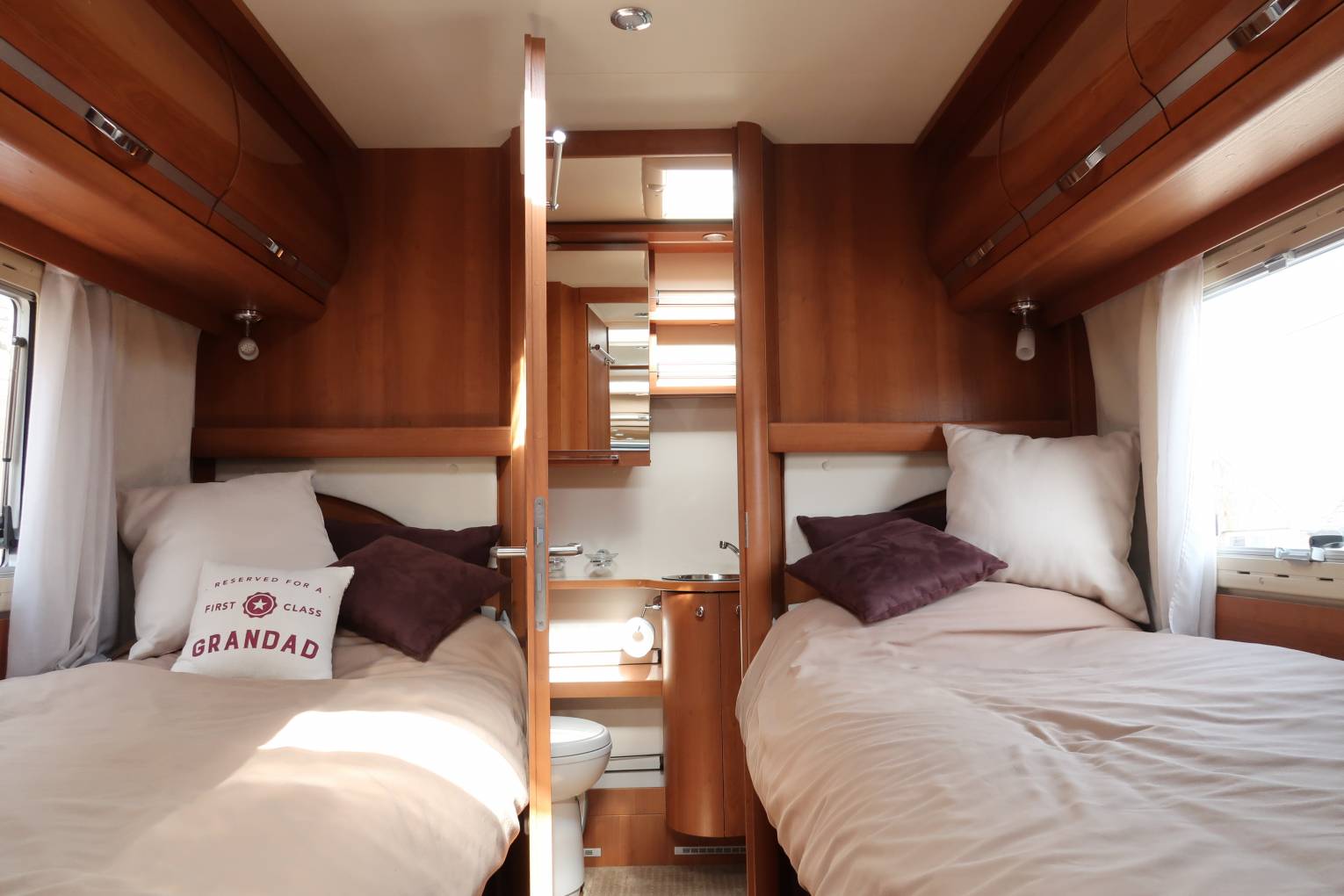 Towards the rear you have the lovely luxury of two fixed single beds so if one of you needs to get up in the night you can do so without waking up your partner. Underneath the beds are substantial storage areas, and when you add this to the storage capacity in the garage this motorhome gives you the opportunity to pack plenty of your belongings if you want to go long-term touring.
