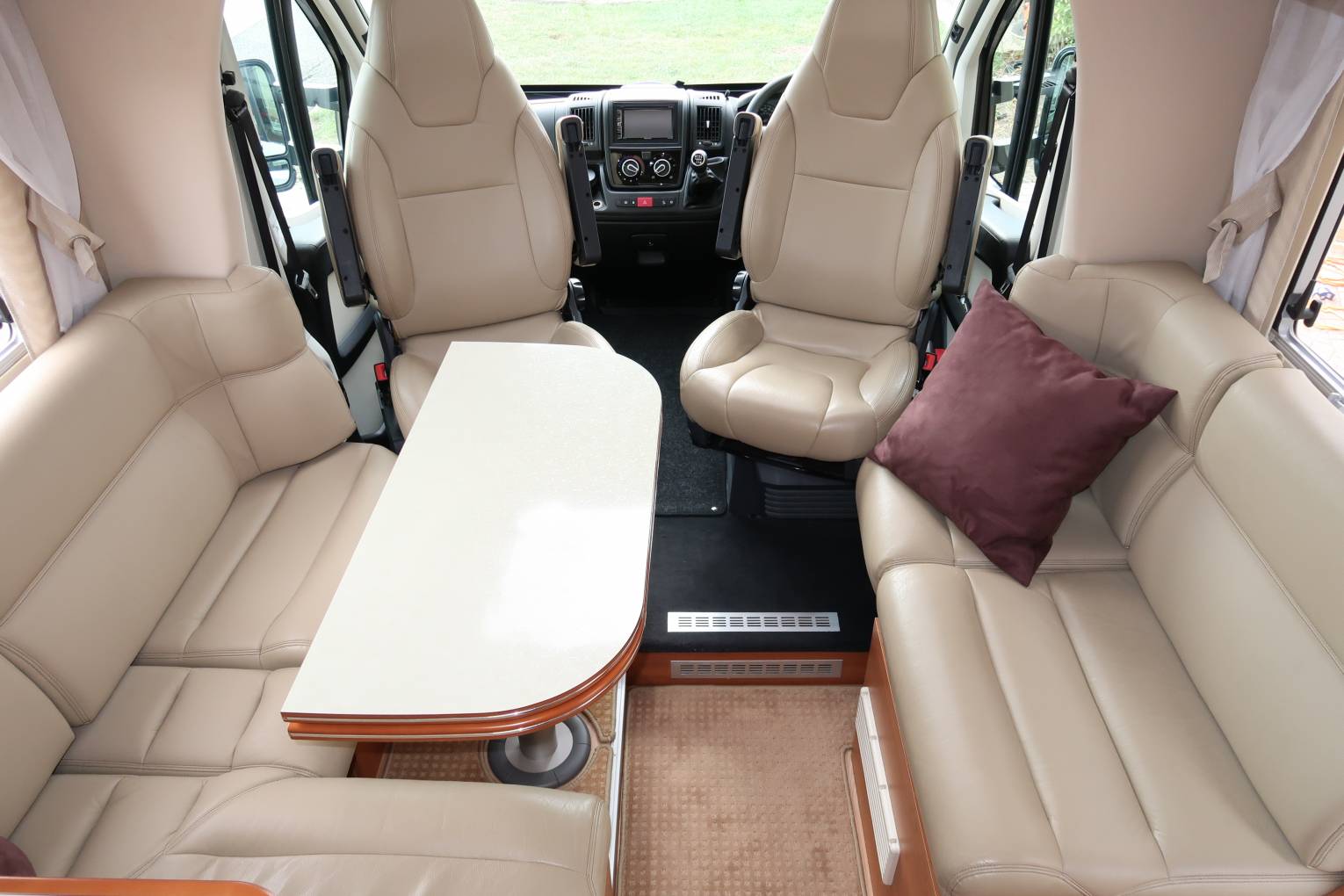 Behind the cab is the standout feature of this lovely motorhome. Here you have a spacious and airy lounge which is a wonderful spot for family and friends to come together for meals, drinks and fun times. On the nearside is an L shape sofa fitted with two additional seat belts and on the offside there is a side facing sofa. Spin the 2 swivel front seats around and 6 people can easily dine in comfort. Above the lounge is a king-size drop-down bed which gives you all the benefits of a fixed bed without taking up any floor space.