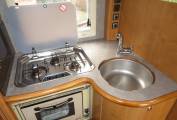 Moving forward there is an excellent, well equipped kitchen area featuring a 3 gas burner hob, oven and grill. With a three way fridge freezer and plenty of storage, this is an ideal area to prepare the perfect meal to enjoy on your trips away.