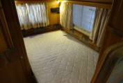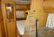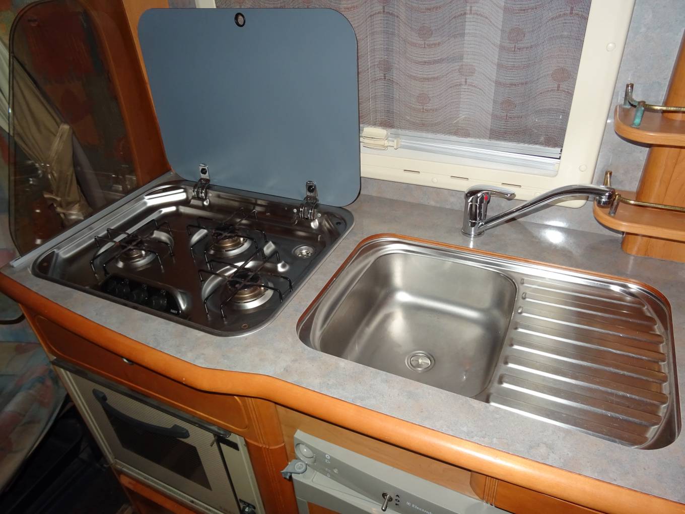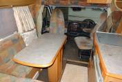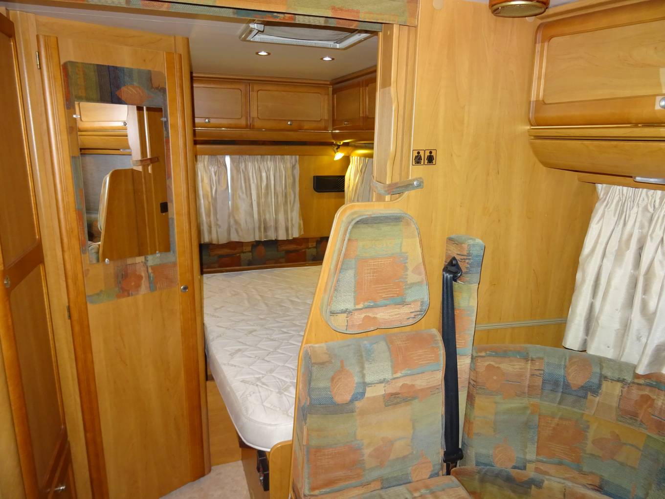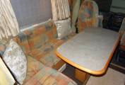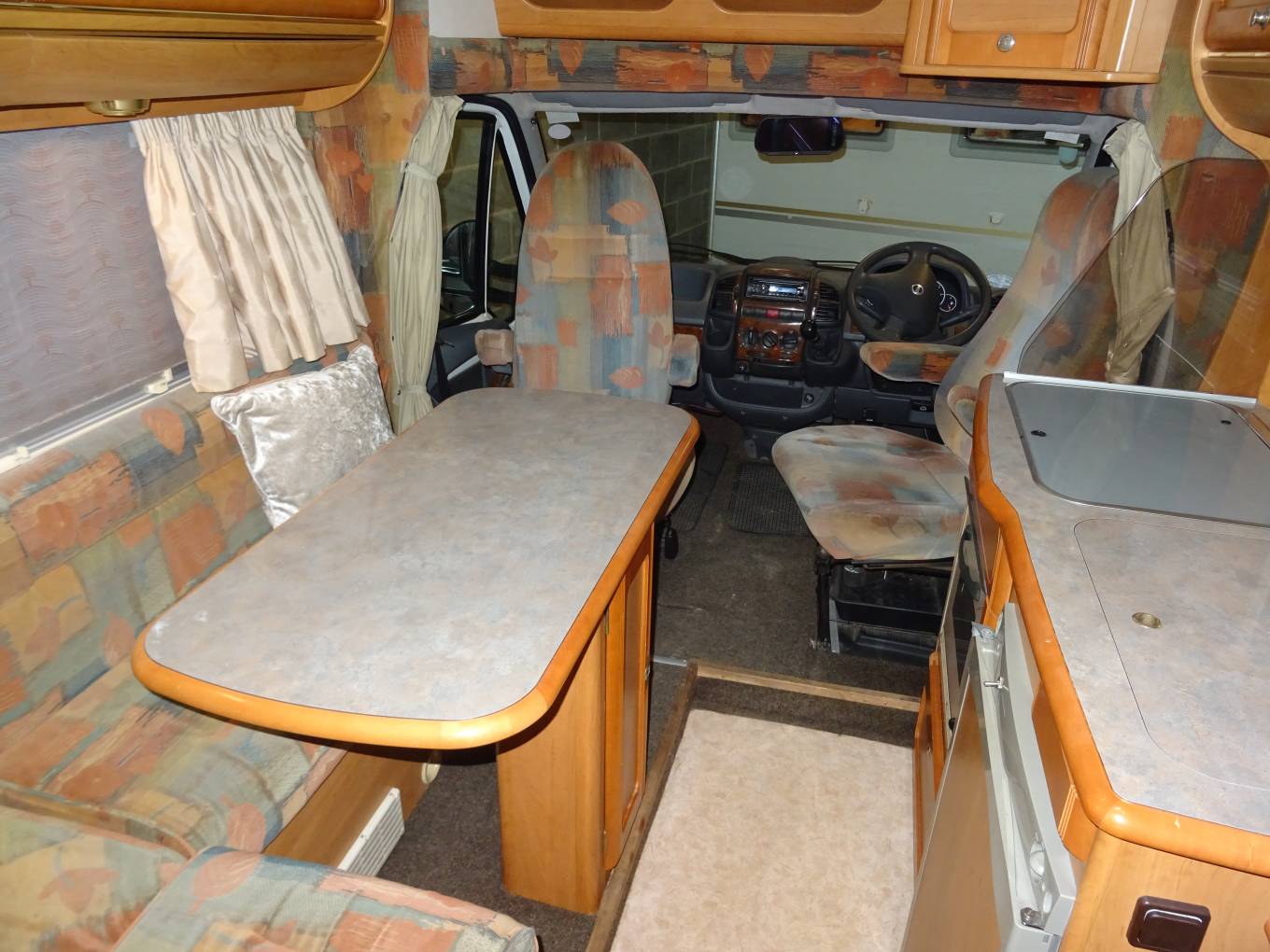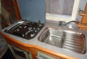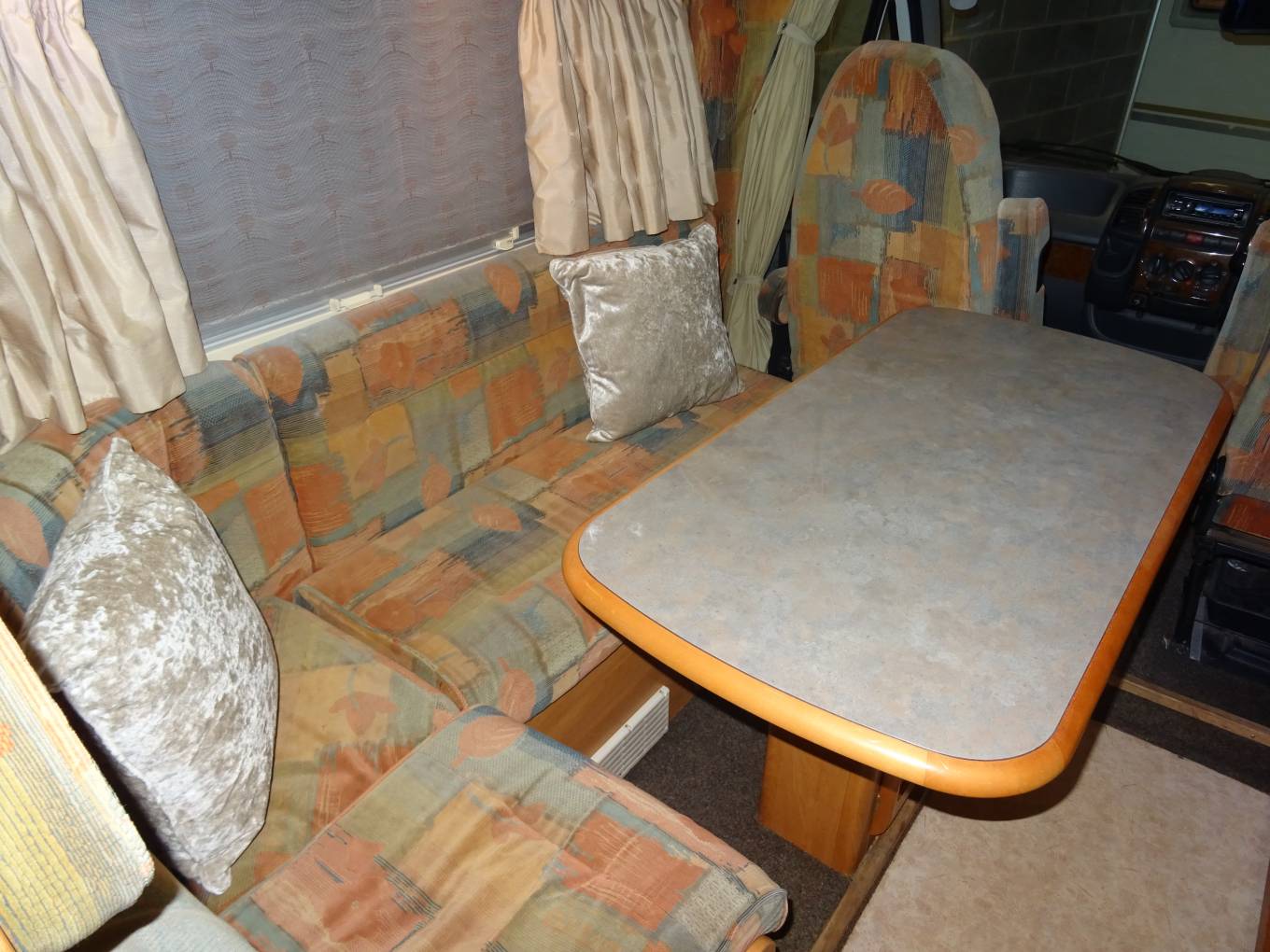 In the habitation area you will find a large L shape sofa with one additional seat belt, two swivel front seats and a fixed dining table. The kitchen comes equipped with Smev 3 ring gas hob, Smev gas oven and grill, stainless steel sink and drainer and 3 way fridge with smaller freezer compartment.