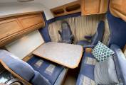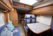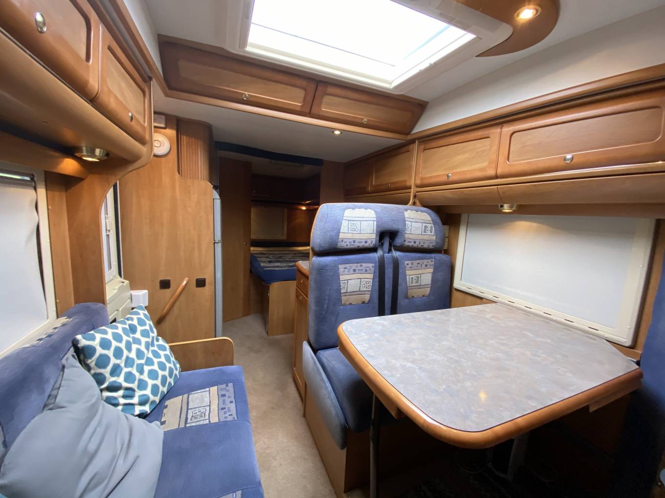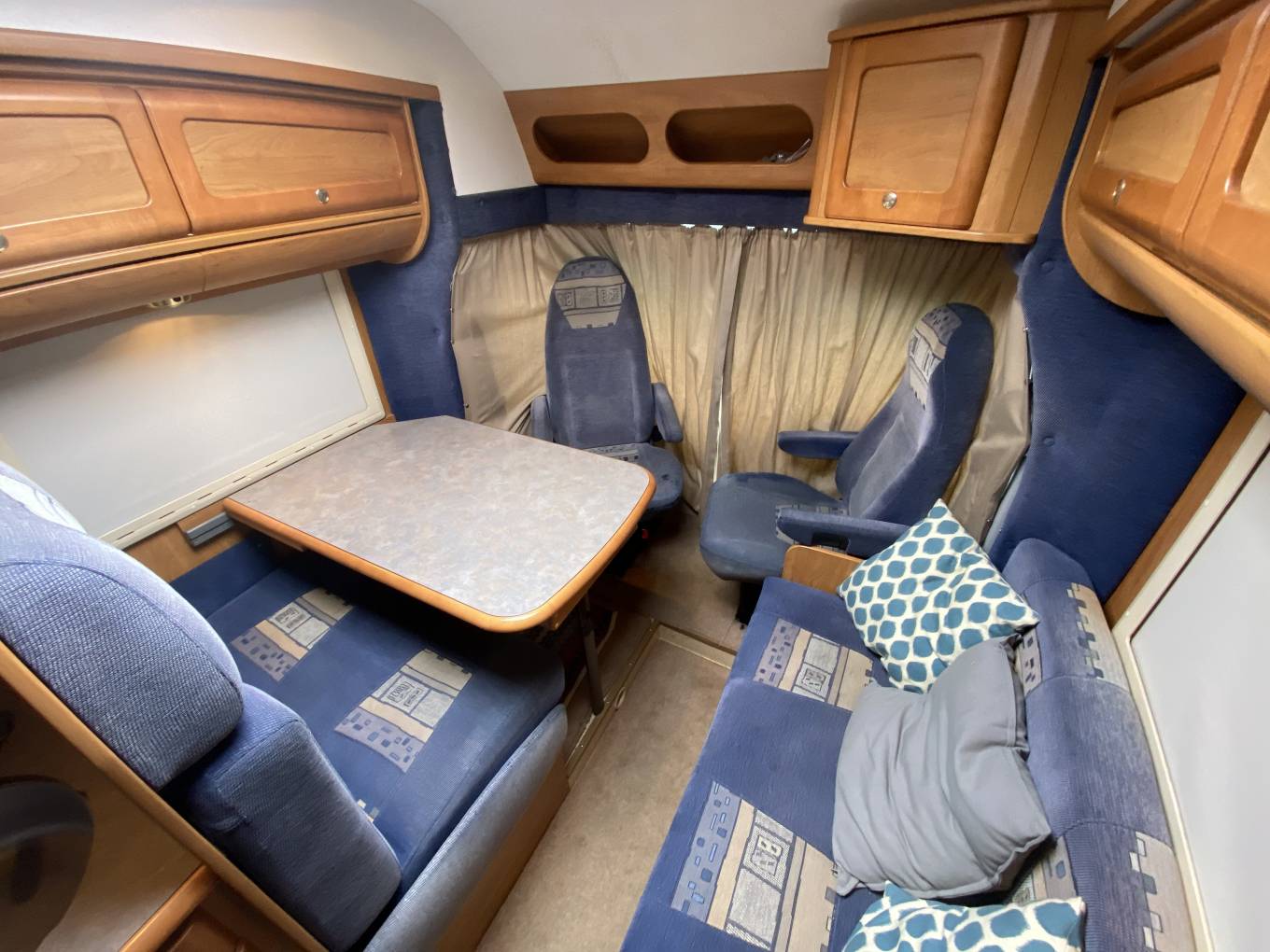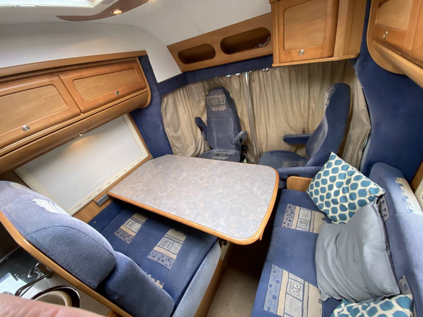 On entering via the habitation door, to your right is a two seater settee and in front of you twin forward facing belted seats with an extendable dining table which can be removed if required.
