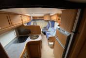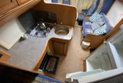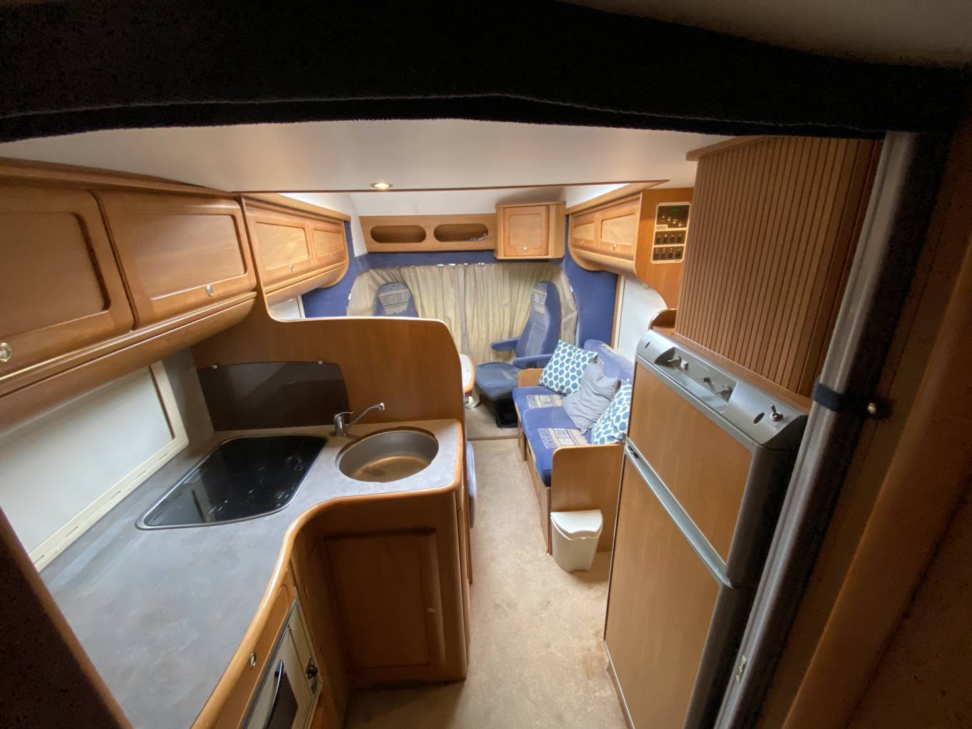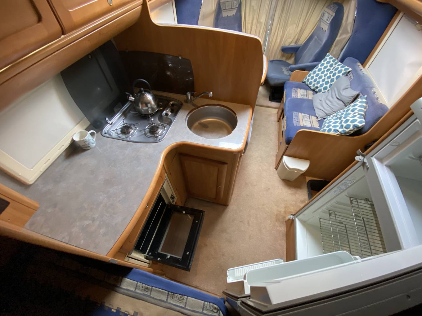Across the centre of the motorme is the kitchen consisting of a three burner hob, a combined oven and grill, a Dometic/Electrolux fridge and separate freezer, sink, enough worktop and plenty of cupboard space.