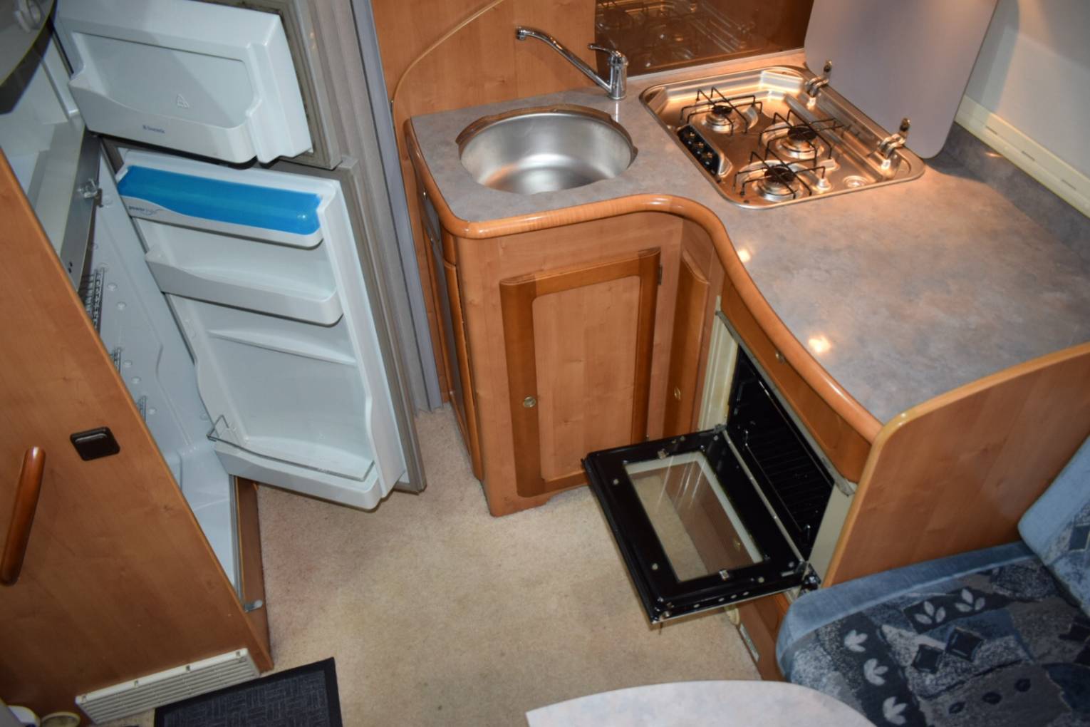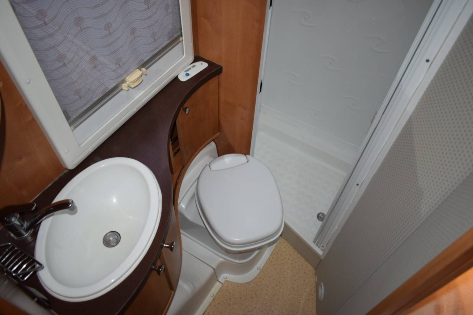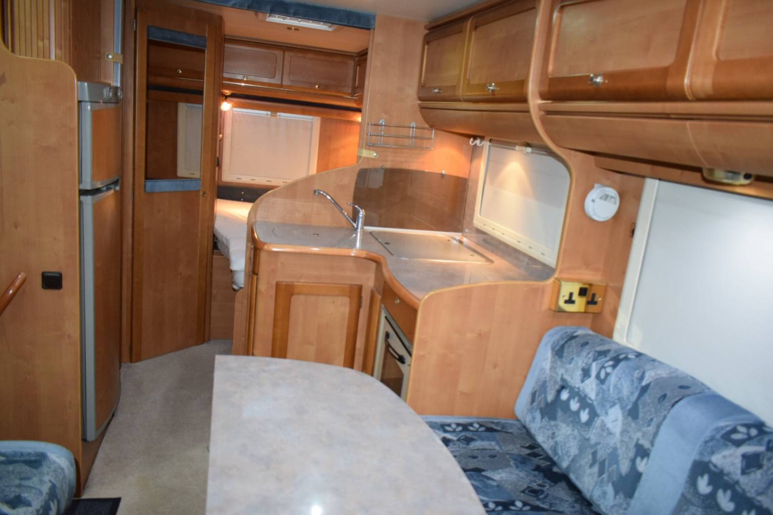 On entering via the caravan door to your right is the lounge area consisting of two inward facing settees, two swivelling cab seats and a fully adjustable dining table that folds in half creating more room when lounging. To the left of the entrance door is the fully equipped kitchen with a large fridge freezer on the door side and opposite a three burner hob with extractor fan above, an oven with combined grill, sink and loads of cupboard space. A foldaway screen leads to the bedroom with ensuite bathroom. The double fixed French bed has access to huge amount of storage underneath where you will also find a safe. This storage area is also accessible from outside. In the other corner is the bathroom with a separate shower, wash hand basin and Thetford Toilet. Outside a Towbar, Bike Rack, Shower point, Barbecue point, TV aerial, a Reversing Camera and a Fiamma Awing have been fitted. As well as cab curtains, there is also an external silver screen included, plus two leisure batteries and a gas bottle.