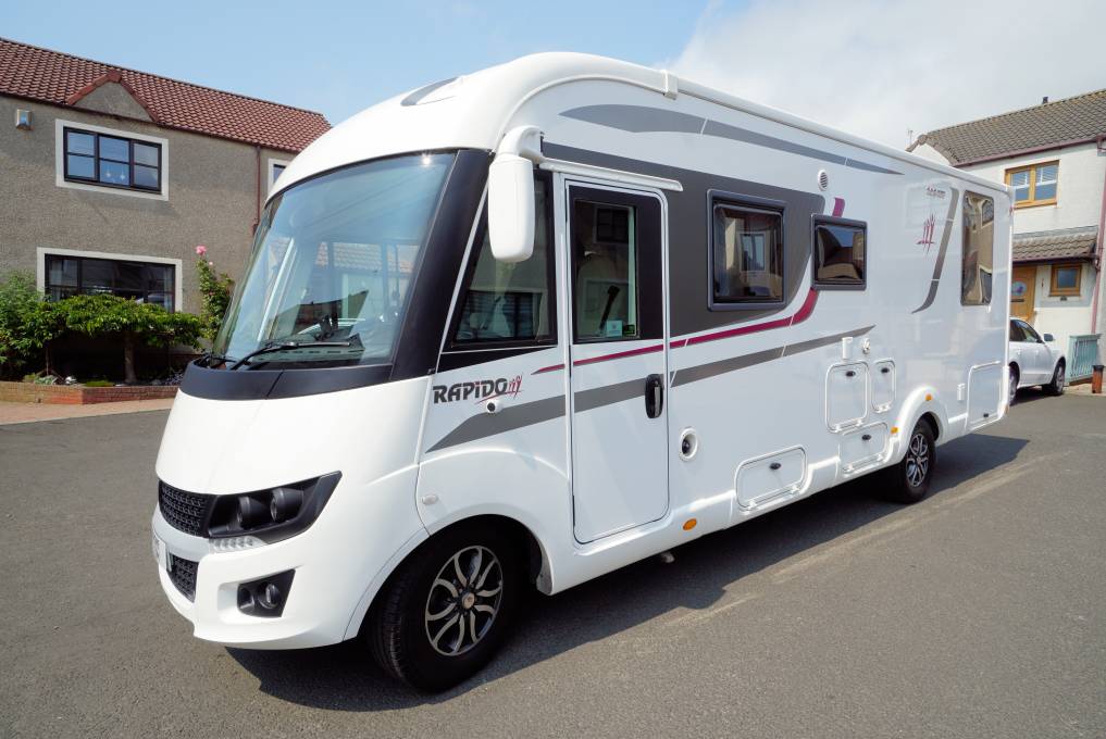 For sale we have a fantastic 2019 Rapido 8094DF, A-class motorhome with 4-berths, 4-seatbelts, end L-shaped lounge and drop-down, over-cab double bed. Based on the 2.3ltr, 150hp Fiat Ducato engine with the 6-speed Comfort-Matic automatic gearbox, cruise-control, air-con, sat-nav, Kenwood entertainment system, reversing / rear-view camera / front near-side camera and Bluetooth handsfree connection.