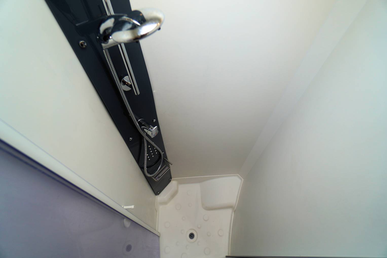 As you step into the motorhome, the dining area is towards the front of the motorhome and has 2 bench seats with a folding dining table and with the front seats swivelled into the area it gives you ample room for 6 to dine in comfort and style. There is a large drop-down, over-cab bed that is accessed by a small ladder and the cab has blinds fitted to the windscreen and side windows for the evening. In the centre of the motorhome is the well-appointed kitchen area with 3-burner gas hob with extractor fan, oven, grill, stainless-steel sink with mixer-tap and opposite a large fridge with separate freezer compartment. A TV is located above the fridge that can be viewed from the dining area. Moving towards the rear of the motorhome is the washroom with Thetford cassette toilet, basin with mixer-tap, and storage cupboards. A benefit this motorhome has is the separate shower compartment found opposite the washroom. At the rear you will find the luxurious l-shaped lounge area that is extremely comfortable with side windows and a skylight that makes it very bright and really is a lovely area to relax in. There is a TV point at the corner cupboard and sliding doors can be closed for privacy if this area is being used as a double bed at night.