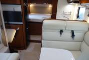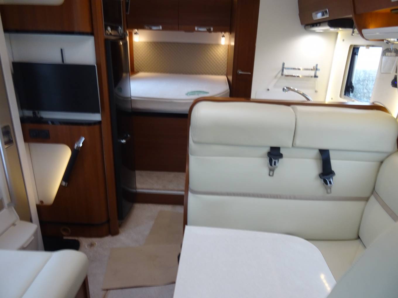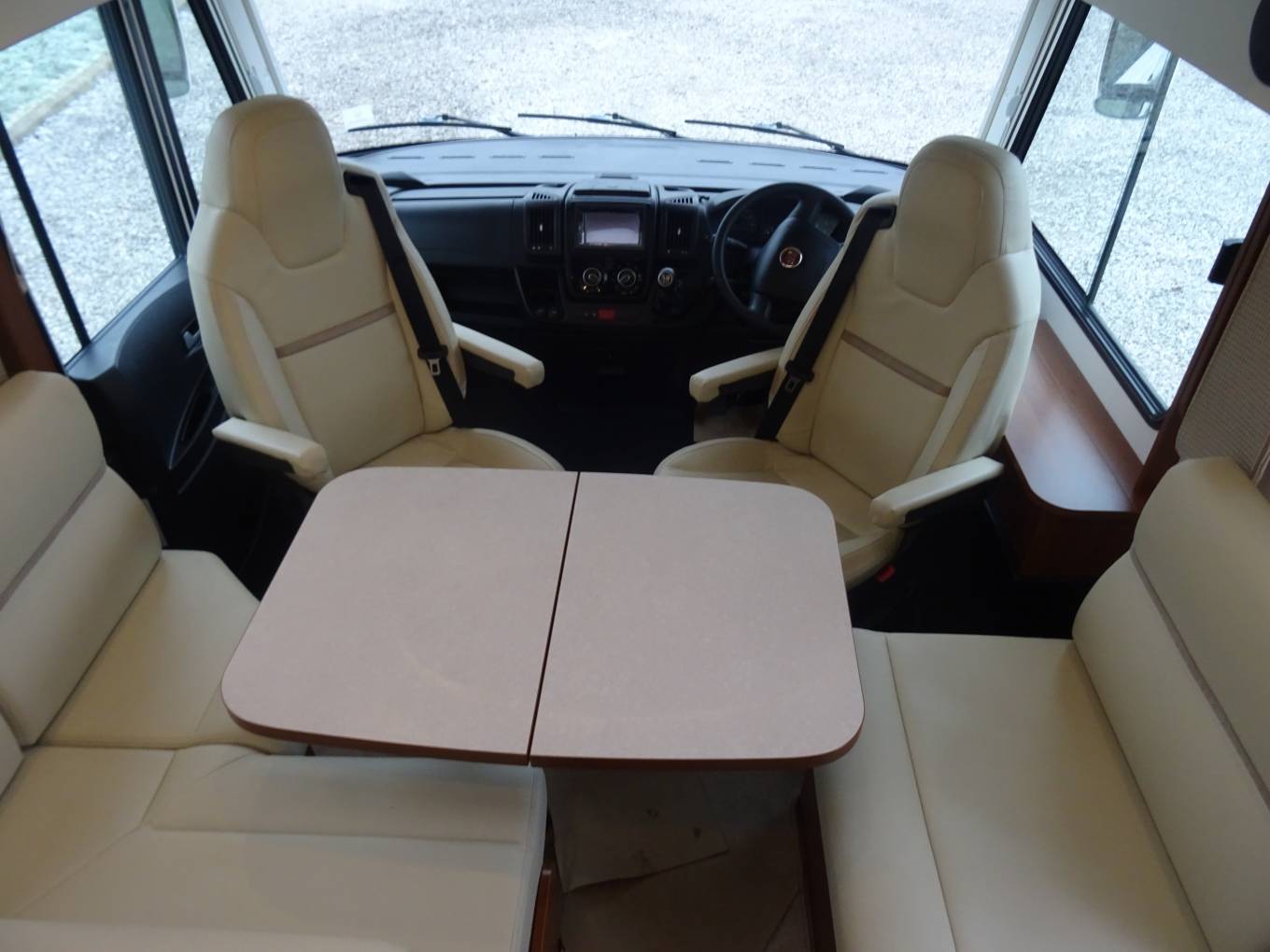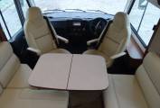 The lounge is gorgeous and very comfortable with the cab seats rotated - it is the leather grade. There are 3 belted seats in this lounge area and a fully adjustable fixed table, our 2nd TV, good storage, and a sky light. There is a pull-down bed above the cab. The cab has the A Class comfort with the large wrap around screen and fitted blinds. We have the Media pack, cruise control, reversing camera, USB points, tablet holder, fitted cab blinds, coach style mirrors and ABS.