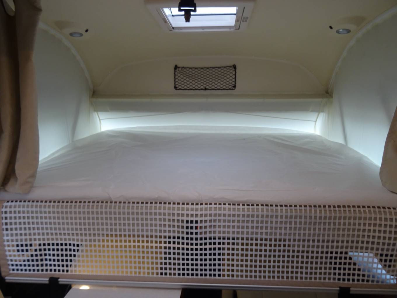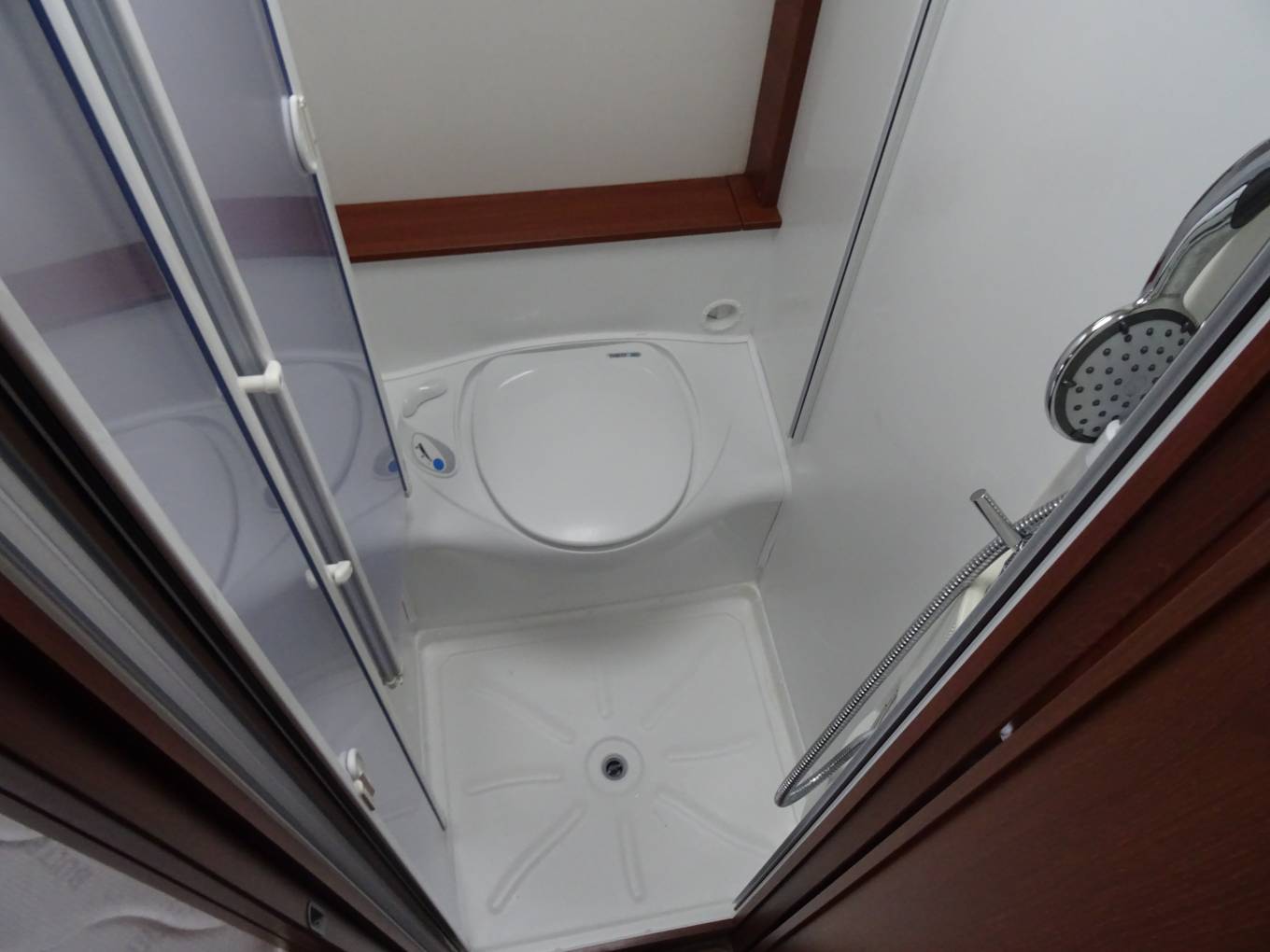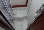 At the rear is the en-suite bedroom, we have an island bed sided by the compact integrated shower/toilet. The wash basin is external to the toilet and is smartly designed to come into play when needed. There are 2 mirrored vanity cabinets. The bed lifts up giving us lots of storage, there are 2 overhead storage units, 2 windows, a sky light, and our 1st 12v TV. The bedroom has a wooden slide door to separate it from the rest of the motorhome, there is a tall storage cupboard with a low hanger wardrobe.