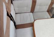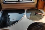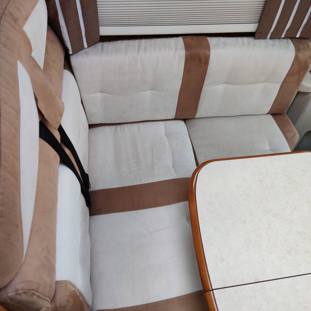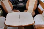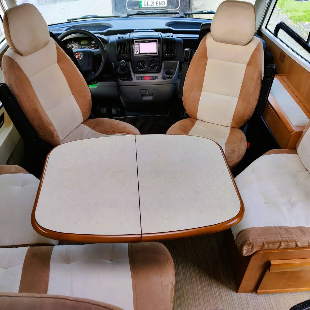 Both cab seats swivel and with the forward facing three point belted seats and side seat, give a social space for up to six to sit. Split fold dining table.
