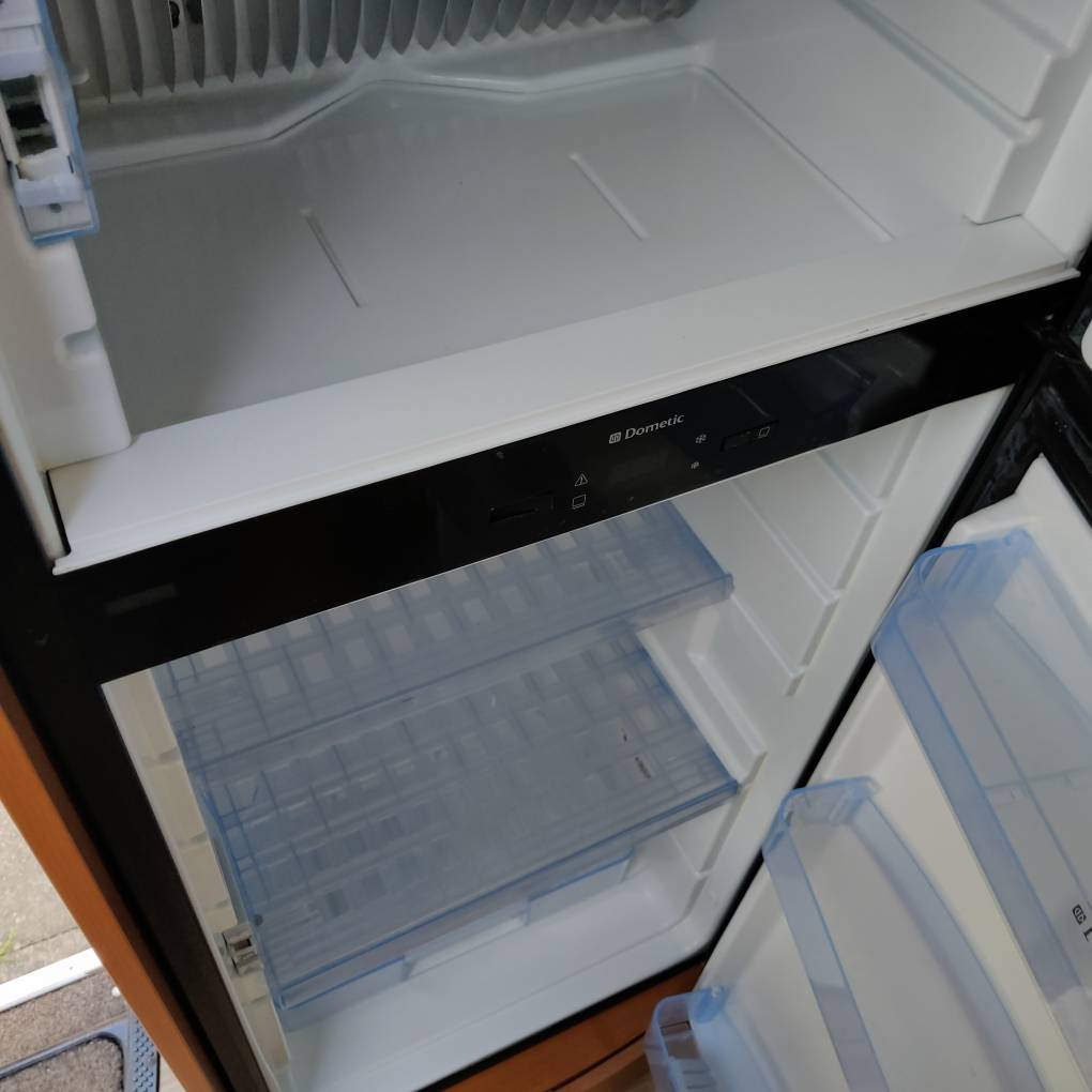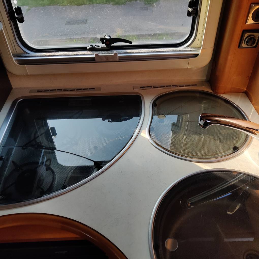 Three burner gas hob, brand new oven and grill, microwave, twin sinks. Tall Dometic auto fridge-freezer unit.