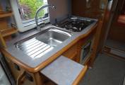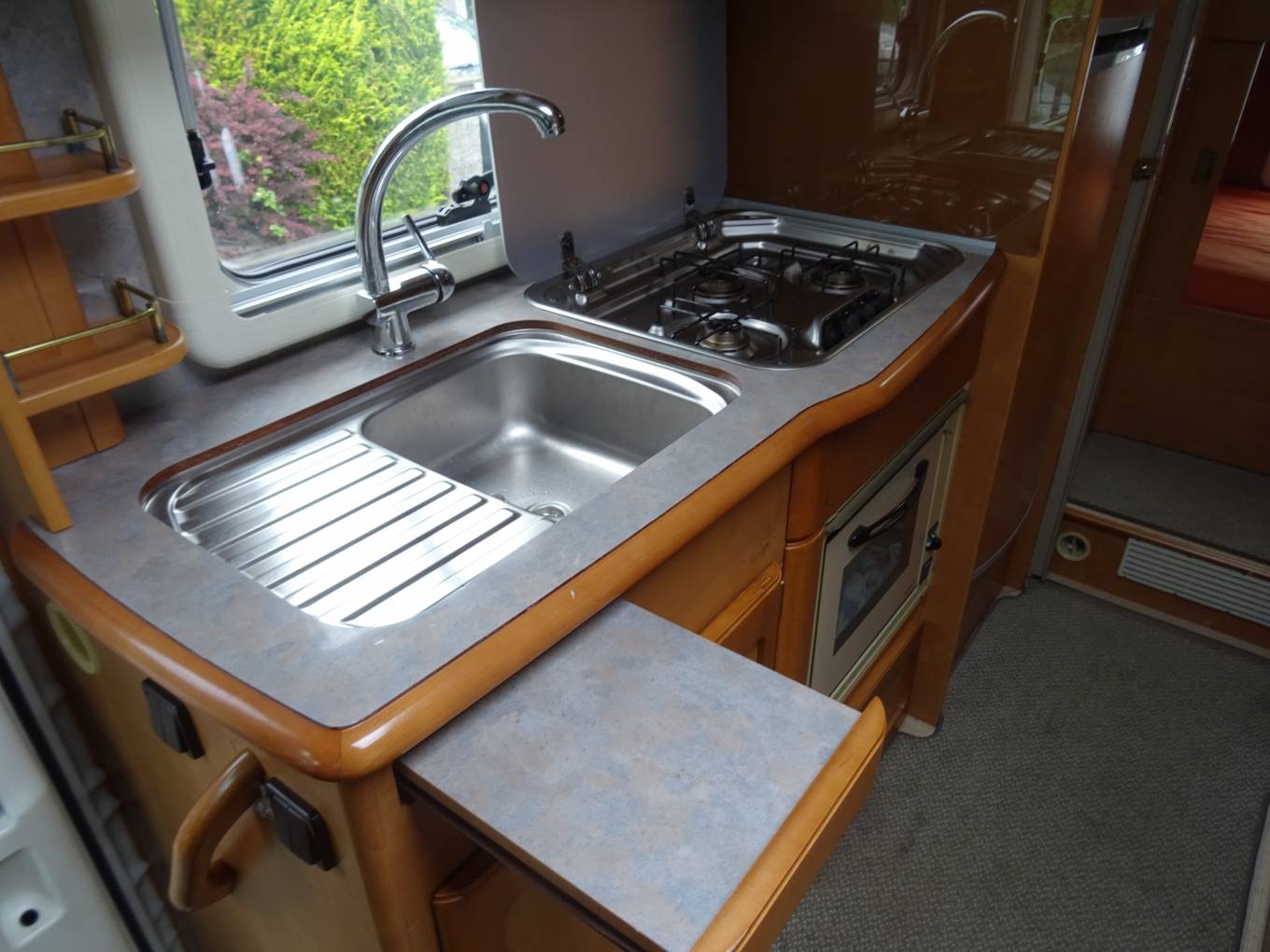 sink with drainer, hob and useful cupboard space above and below. A flap slides