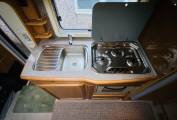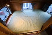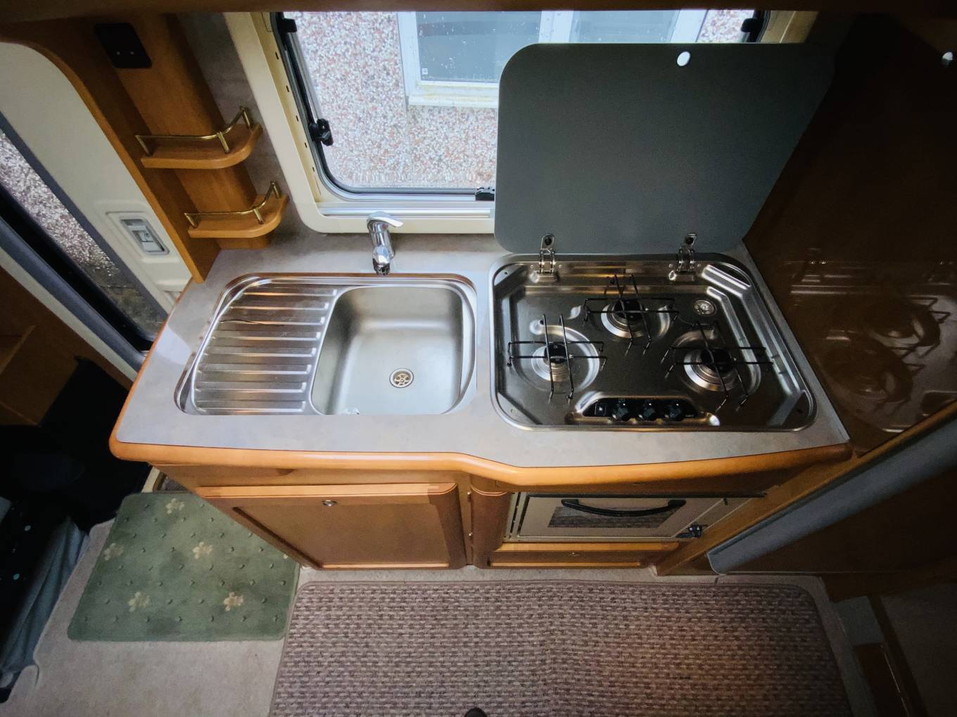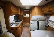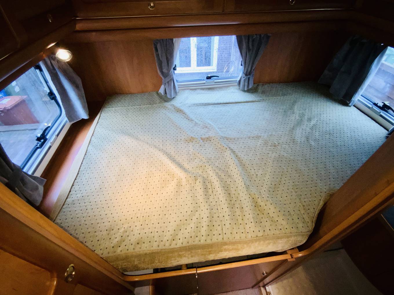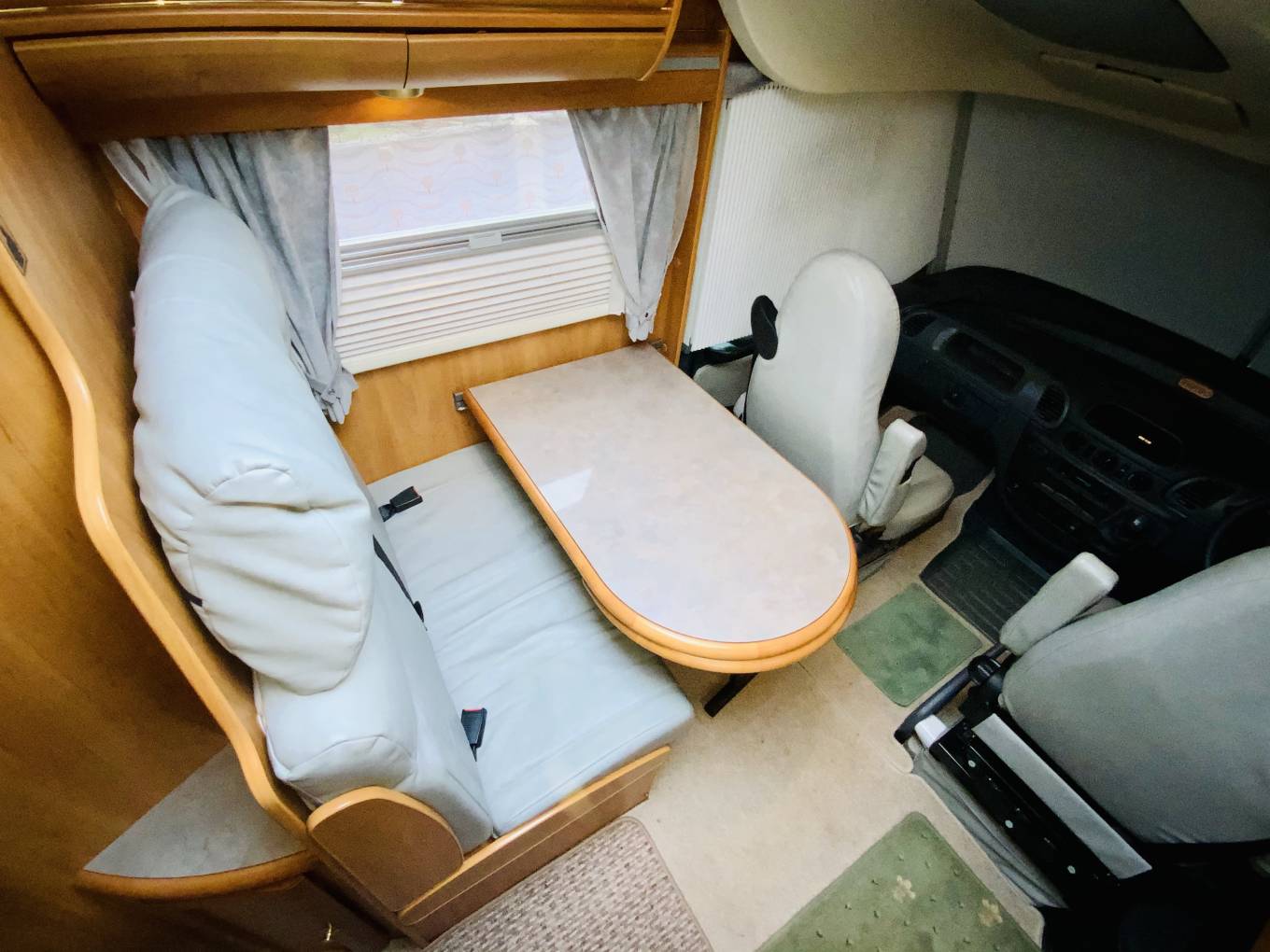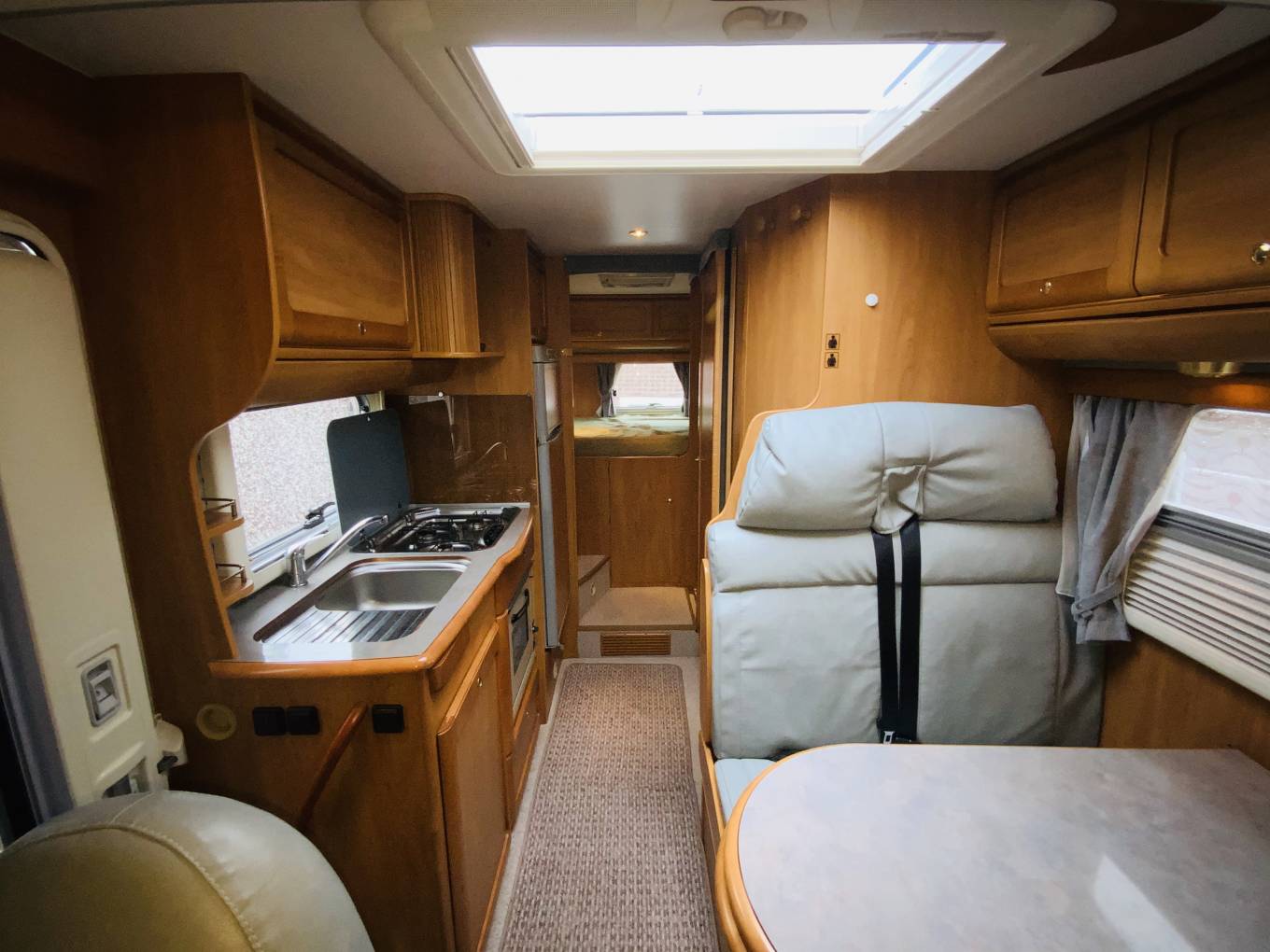 firstly, we start with rear fixed transfer bed. The bed is a good size double and has plenty of storage in the garage below. Next is the washroom. The washroom is a good size and features a separate shower cubicle, toilet and wash basin. As you walk forward we are greeted by the well equipped kitchen. The kitchen includes a large separate fridge freezer, gas hob, grill, oven and wash basin. To the front of the motorhome is a dinette that seats 4 comfortably with 2 swivel seats. Finally, above the cab is a large comfortable double drop down bed. One thing you will notice with this motorhome it is in excellent condition and there is lots of storage.